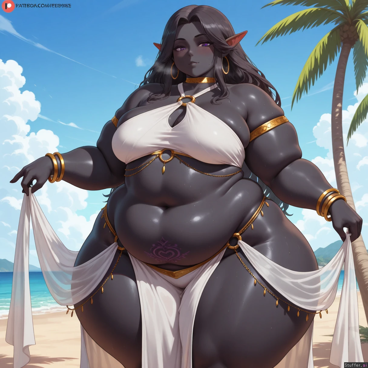best quality), (high rating), absurd res, high res, detailed, ultra quality, (high quality), masterpiece, stunning beauty, (((detailed face))), intricate detail, beautiful face, exquisite detail, absurd resolution, correct anatomy, 8k, high definition picture, (highly detailed face), highly detailed skin texture, detailed background, (((perfect human anatomy))), ((perfect proportions)), Coffeeslice, shexyo, cutesexyrobutts, **Character:** 1girl. Solo. Feedee, elf, (((milf))), **Body Appearance:** ((wide hips:1.8)), medium breasts, ((bottomheavy)), (love handles), ((obese:1.0)), ((bulky limbs)), ((thick thighs:1.5)), ((fat arms:1.4)), ((obese legs:1.45)), ((black skin:1.5)), ((round chubby face:1.5))), ((fat legs:1.6)), cellulite, hip dips, fat rolls, fat ass, **Eye:** purple eyes. **Emotions:** blush, ((horny)), sweaty, submissive, *Hair/Styles:** long hair, black hair, messy, **Clothes:** belly dancer, belly tattoo **Setting:** ((((night)))), beach, **Actions:** (standing), sexual pose, looking at viewer, weight gain, heavy breathing, **Perspective::** ((from side)), close to viewer,
