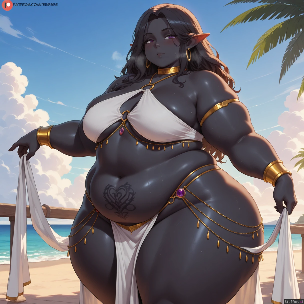 best quality), (high rating), absurd res, high res, detailed, ultra quality, (high quality), masterpiece, stunning beauty, (((detailed face))), intricate detail, beautiful face, exquisite detail, absurd resolution, correct anatomy, 8k, high definition picture, (highly detailed face), highly detailed skin texture, detailed background, (((perfect human anatomy))), ((perfect proportions)), Coffeeslice, shexyo, cutesexyrobutts, **Character:** 1girl. Solo. Feedee, elf, (((milf))), **Body Appearance:** ((wide hips:1.6)), medium breasts, ((bottomheavy)), (love handles), ((obese:1.0)), ((bulky limbs)), ((thick thighs:1.5)), ((fat arms:1.4)), ((obese legs:1.45)), ((black skin:1.5)), ((round chubby face:1.5))), ((fat legs:1.6)), cellulite, hip dips, fat rolls, fat ass, **Eye:** purple eyes. **Emotions:** blush, ((horny)), sweaty, submissive, *Hair/Styles:** long hair, black hair, messy, **Clothes:** belly dancer, belly tattoo **Setting:** ((((night)))), beach, **Actions:** (standing), sexual pose, looking at viewer, weight gain, heavy breathing, **Perspective::** ((from side)), close to viewer,