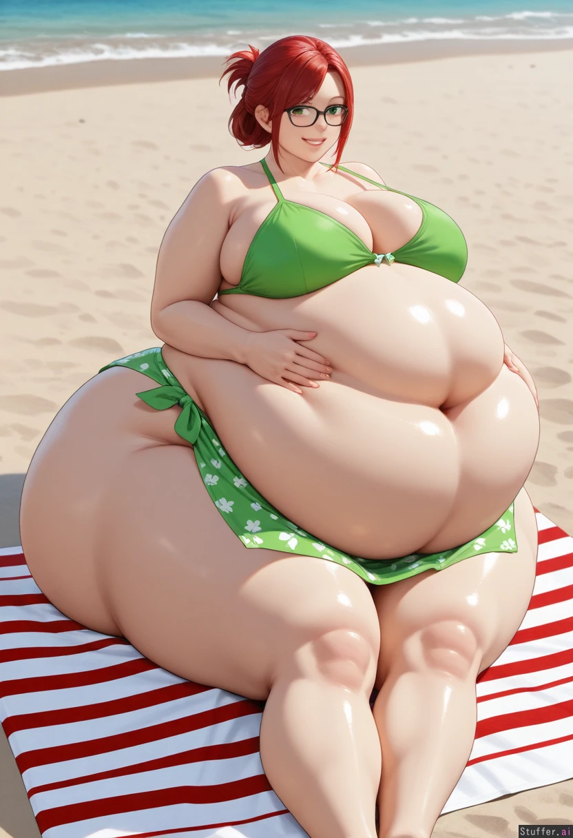 ((Photorealistic)), ((photo realism)), highly detailed, 8k, (( hyper fat:1.9)), ((enormous fat belly:1.9)), An extremely cute 18 years old, girl, very long red hair, hair tied in messy bunches, hypnotic green eyes, cute smile, ((Wide hips:1.8)), ((Fat belly:1.9)), ((enormous fat belly)), ((fat hips)), ((fat ass:1.8)), ((fat legs:1.7)), ((fat heavy breasts)), Tight sarong and a green bikini top, black framed glasses , cute geeky style, Beach summers day, sitting on a blanket, her hands resting around her massive heavy belly, she had a cute grin on her face as she is excited over how big she has become,
