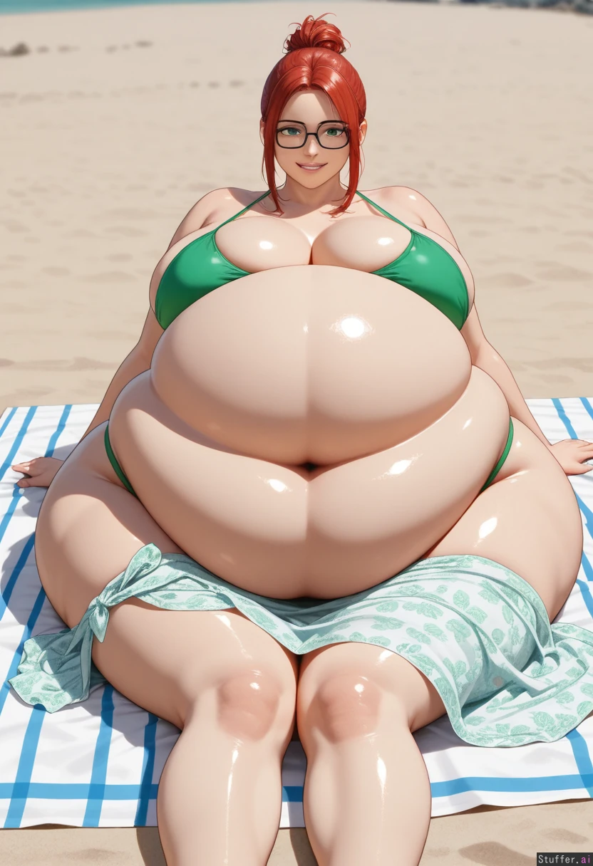 ((Photorealistic)), ((photo realism)), highly detailed, 8k, (( hyper fat:1.9)), ((enormous fat belly:1.9)), An extremely cute 18 years old, girl, very long red hair, hair tied in messy bunches, hypnotic green eyes, cute smile, ((Wide hips:1.8)), ((Fat belly:1.9)), ((enormous fat belly)), ((fat hips)), ((fat ass:1.8)), ((fat legs:1.7)), ((fat heavy breasts)), Tight sarong and a green bikini top, black framed glasses , cute geeky style, Beach summers day, sitting on a blanket, her hands resting around her massive heavy belly, she had a cute grin on her face as she is excited over how big she has become,