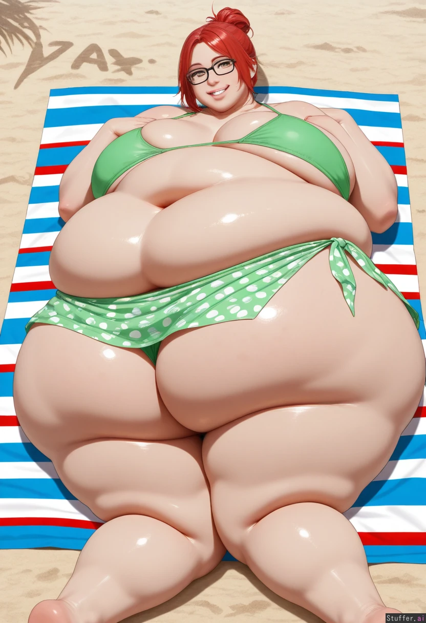 ((Photorealistic)), ((photo realism)), highly detailed, 8k, (( hyper fat:1.9)), ((enormous fat belly:1.9)), An extremely cute 18 years old, girl, very long red hair, hair tied in messy bunches, hypnotic green eyes, cute smile, ((Wide hips:1.8)), ((Fat belly:1.9)), ((enormous fat belly)), ((fat hips)), ((fat ass:1.8)), ((fat legs:1.7)), ((fat heavy breasts)), Tight sarong and a green bikini top, black framed glasses , cute geeky style, Beach summers day, laying down on a blanket, she had a cute grin on her face as she is excited over how big she has become,