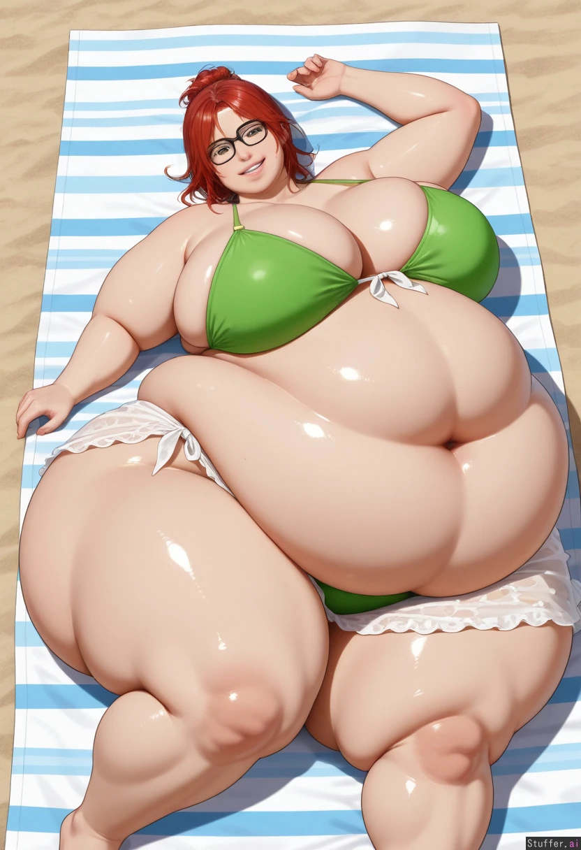 ((Photorealistic)), ((photo realism)), highly detailed, 8k, (( hyper fat:1.9)), ((enormous fat belly:1.9)), An extremely cute 18 years old, girl, very long red hair, hair tied in messy bunches, hypnotic green eyes, cute smile, ((Wide hips:1.8)), ((Fat belly:1.9)), ((enormous fat belly)), ((fat hips)), ((fat ass:1.8)), ((fat legs:1.7)), ((fat heavy breasts)), Tight sarong and a green bikini top, black framed glasses , cute geeky style, Beach summers day, laying down on a blanket, she had a cute grin on her face as she is excited over how big she has become,