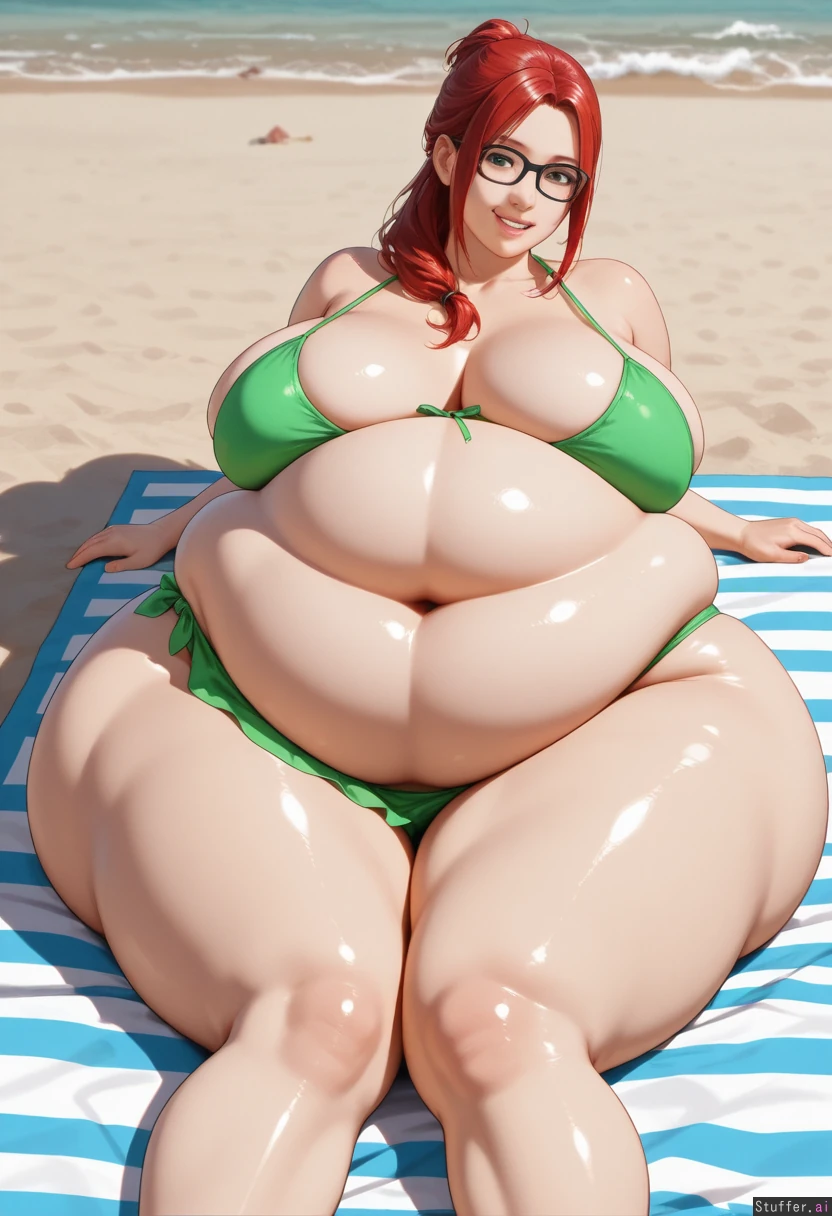 ((Photorealistic)), ((photo realism)), highly detailed, 8k, (( hyper fat:1.9)), ((enormous fat belly:1.9)), An extremely cute 18 years old, girl, very long red hair, hair tied in messy bunches, hypnotic green eyes, cute smile, ((Wide hips:1.8)), ((Fat belly:1.9)), ((enormous fat belly)), ((fat hips)), ((fat ass:1.8)), ((fat legs:1.7)), ((fat heavy breasts)), Tight sarong and a green bikini top, black framed glasses , cute geeky style, Beach summers day, laying down on a blanket, she had a cute grin on her face as she is excited over how big she has become,
