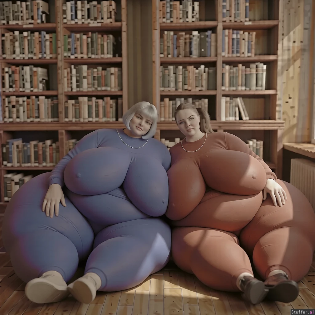 high quality, masterpiece, realistic lighting, high detail, they lean forward, make their breasts bulging and massively bigger and wider and hanging, their thighs are extremely massive and fat, their hips are extremely wide and fat,