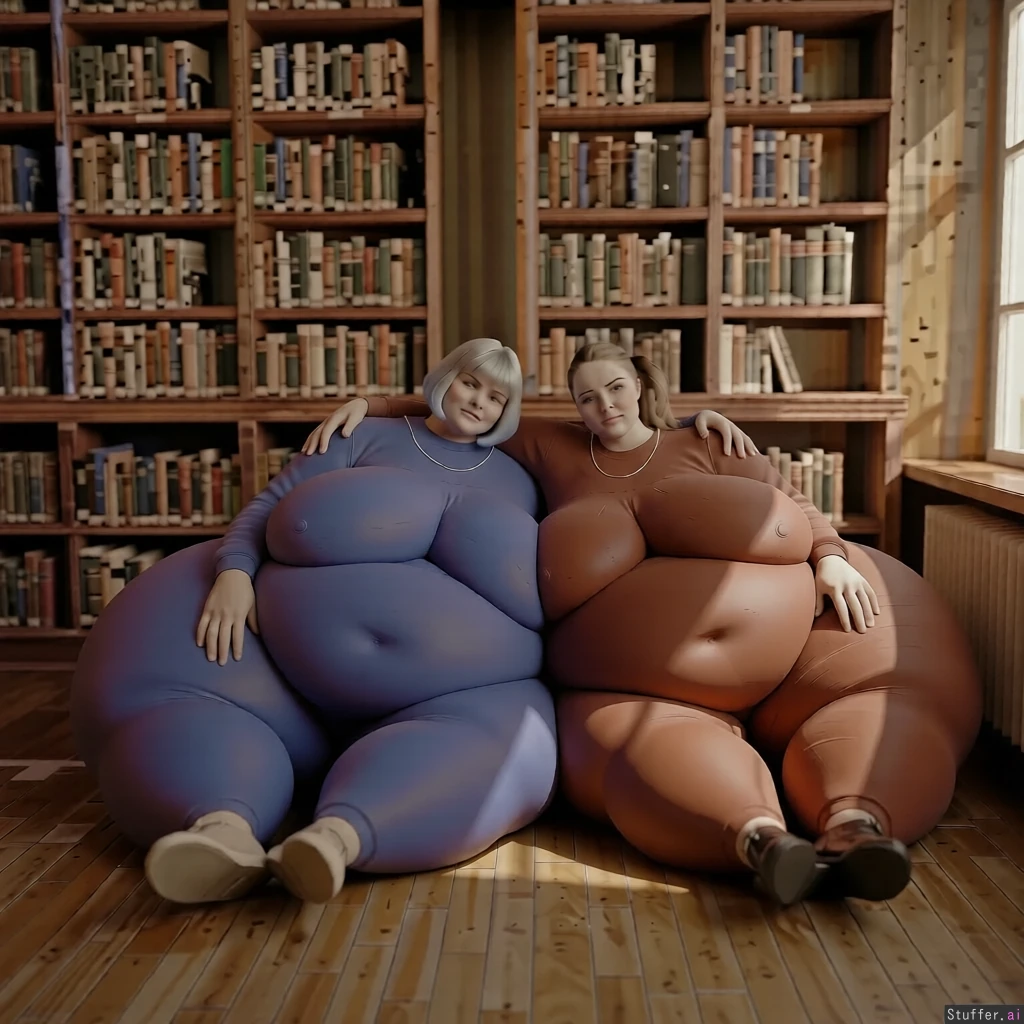 high quality, masterpiece, realistic lighting, high detail, make their belly bulging and massively bigger and wider and hanging, their thighs are extremely massive and fat, their hips are extremely wide and fat,arms around shoulders