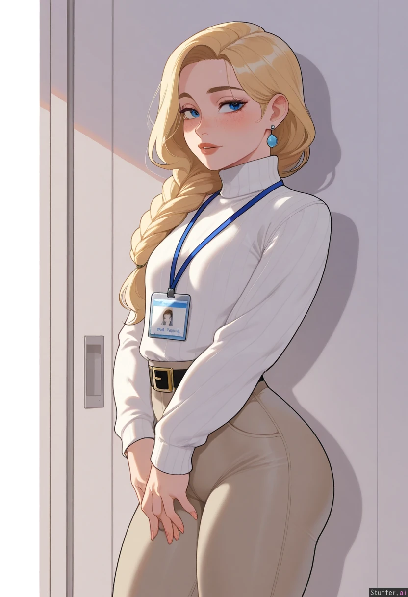 (highly detailed, best quality), (perfect lighting, vibrant colors, shadow, perfect shading), (Krekkov (artist), KAMII MOMORU (artist), nyantcha (artist)), solo, adult, college girl, (long braided blonde hair, blue eyes, freckles), (small chested) (sexy pose), (Mature), (white turtleneck sweater)), ((high-waist tight khaki pants 1.5)), ((business-woman)), (wearing a lanyard around neck), (cute earrings), (thin black belt), (sweater tucked into pants), (office background), (Blushing, alluring, horny), side view