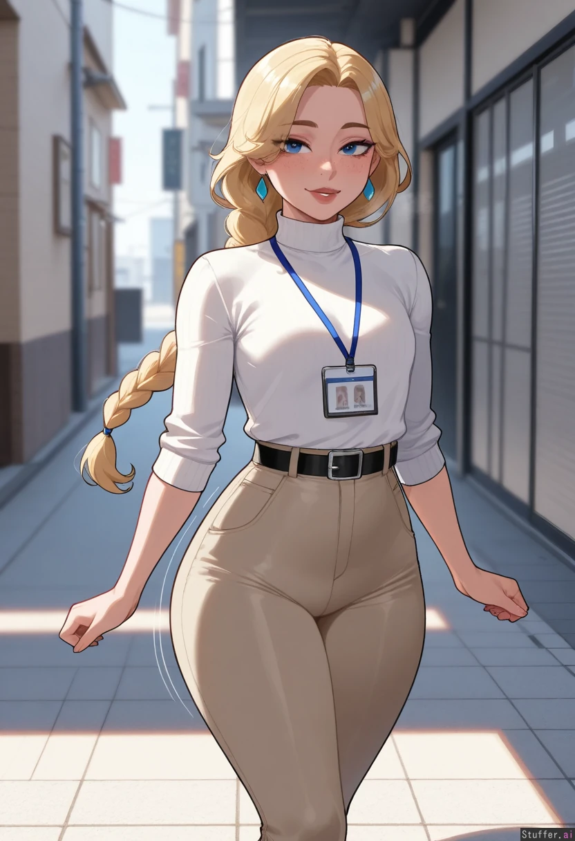 (highly detailed, best quality), (perfect lighting, vibrant colors, shadow, perfect shading), (Krekkov (artist), KAMII MOMORU (artist), nyantcha (artist)), solo, adult, college girl, (long braided blonde hair, blue eyes, freckles), (small chested) (sexy pose), (Mature), (white turtleneck sweater)), ((high-waist tight khaki pants 1.5)), ((business-woman)), (wearing a lanyard around neck), (cute earrings), (thin black belt), (sweater tucked into pants), Walking, flirty, sidewalk, Columbia; glance at viewer, butt motion lines, jiggly; (Blushing, alluring, horny),
