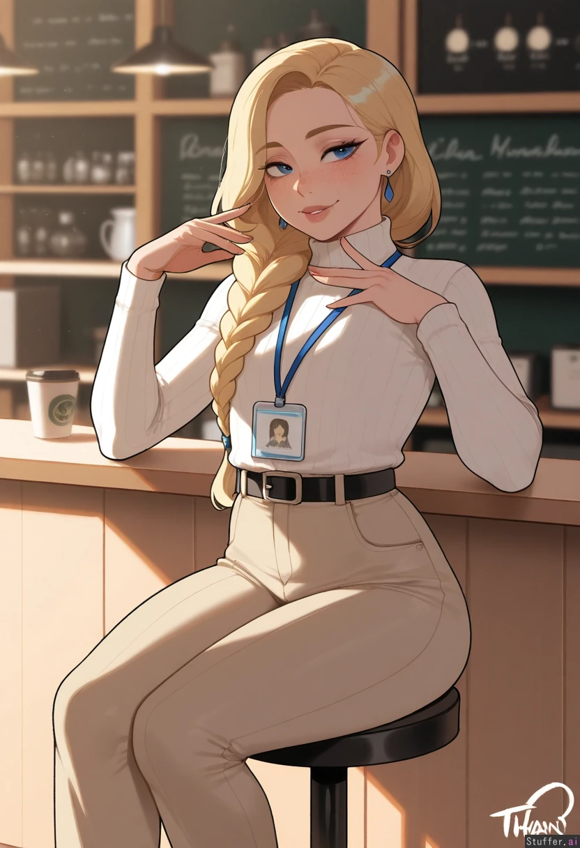 (highly detailed, best quality), (perfect lighting, vibrant colors, shadow, perfect shading), (Krekkov (artist), KAMII MOMORU (artist), nyantcha (artist)), solo, adult, college girl, (long braided blonde hair, blue eyes, freckles), (small chested) (sexy pose), (Mature), (white turtleneck sweater)), ((high-waist tight khaki pants 1.5)), ((business-woman)), (wearing a lanyard around neck), (cute earrings), (thin black belt), (sweater tucked into pants), sitting on stool in Coffee shop, Confidant pose, (Blushing, alluring, horny),