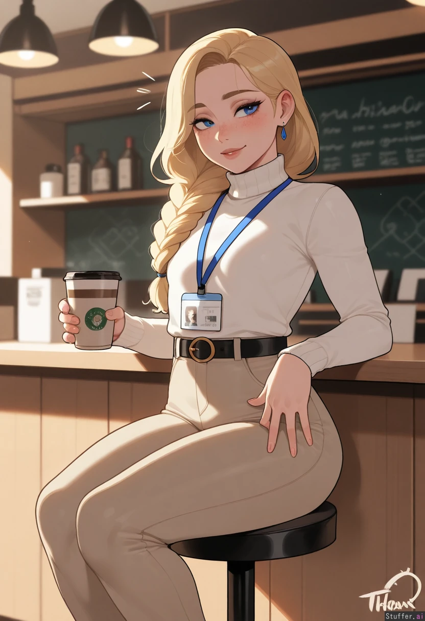 (highly detailed, best quality), (perfect lighting, vibrant colors, shadow, perfect shading), (Krekkov (artist), KAMII MOMORU (artist), nyantcha (artist)), solo, adult, college girl, (long braided blonde hair, blue eyes, freckles), (small chested) (sexy pose), (Mature), (white turtleneck sweater)), ((high-waist tight khaki pants 1.5)), ((business-woman)), (wearing a lanyard around neck), (cute earrings), (thin black belt), (sweater tucked into pants), sitting on stool in Coffee shop, Confidant pose, grabbing thighs (Blushing, alluring, horny),