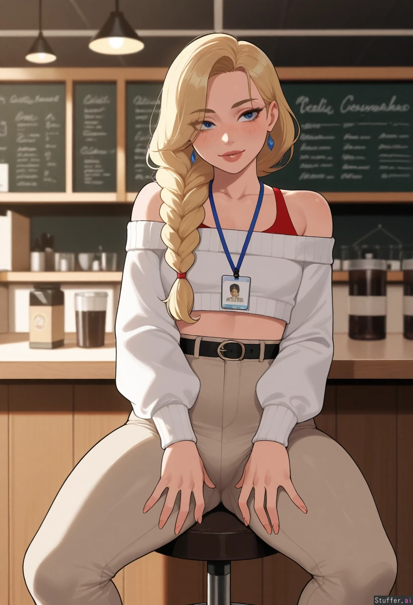(highly detailed, best quality), (perfect lighting, vibrant colors, shadow, perfect shading), (Krekkov (artist), KAMII MOMORU (artist), nyantcha (artist)), solo, adult, college girl, (long braided blonde hair, blue eyes, freckles), (small chested) (sexy pose), (Mature), (white off the shoulder cropped sweater)), ((high-waist tight khaki pants 1.5)), ((business-woman)), (wearing a lanyard around neck), (cute earrings), (thin black belt), (red thong peaking out of pants), sitting on stool in Coffee shop, Confidant pose, grabbing thighs (Blushing, alluring, horny),