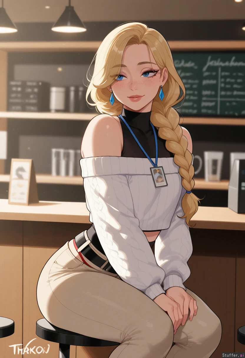 (highly detailed, best quality), (perfect lighting, vibrant colors, shadow, perfect shading), (Krekkov (artist), KAMII MOMORU (artist), nyantcha (artist)), solo, adult, college girl, (long braided blonde hair, blue eyes, freckles), (small chested) (sexy pose), (Mature), (white off the shoulder cropped sweater)), ((tight khaki pants 1.5)), ((business-woman)), (wearing a lanyard around neck), (cute earrings), (thin black belt), (red thong peaking out of pants), sitting on stool in Coffee shop, Confidant pose, grabbing thighs (Blushing, alluring, horny),