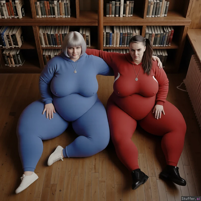 high quality, masterpiece, realistic lighting, high detail, make their thighs and hips bulging and massively bigger and wider and hanging, arms around shoulders, view from above, they are further from the camera