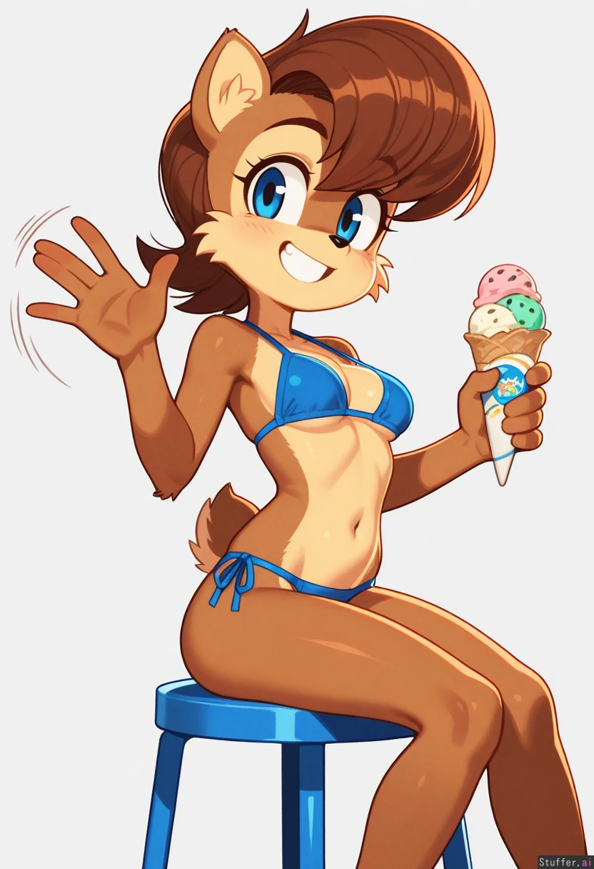 wamudraws(artist), kipteitei, ((lineless:1.4)), perfect proportions, flat colors, ((best_quality, high_resolution)), side_view:2, (wearing blue bikini top and blue bikini bottom), solo ((Sally Acorn)), furry, mobian, blank background, skinny, smiling, sitting on a blue stool, slight weight gain, holding ice cream with 8 scoops in one hand, jiggle motion lines, waving to someone with the other hand, looking the other way