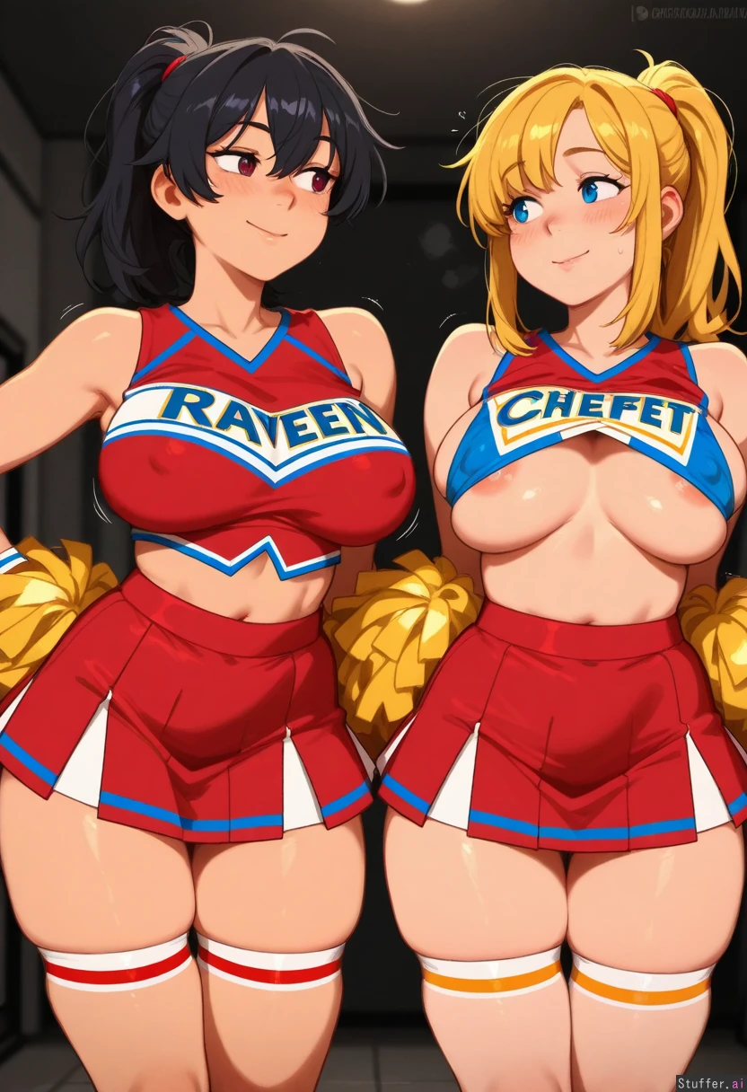 highly detailed, best quality, perfect anatomy, perfect proportions, perfect lighting, warm lighting, perfect shading, beautiful face, beautiful eyes, Krekkov /(artist/), KAMII MOMORU /(artist/), khyle /(artist/), 2girls,((Cheerleader, blonde, raven hair, ponytail, blue uniform, red uniform, confident)), ((skindentation)), motion lines, (Having an argument), ((Large breasts, round breasts,, breasts_apart, nipple_outline): 1.00),