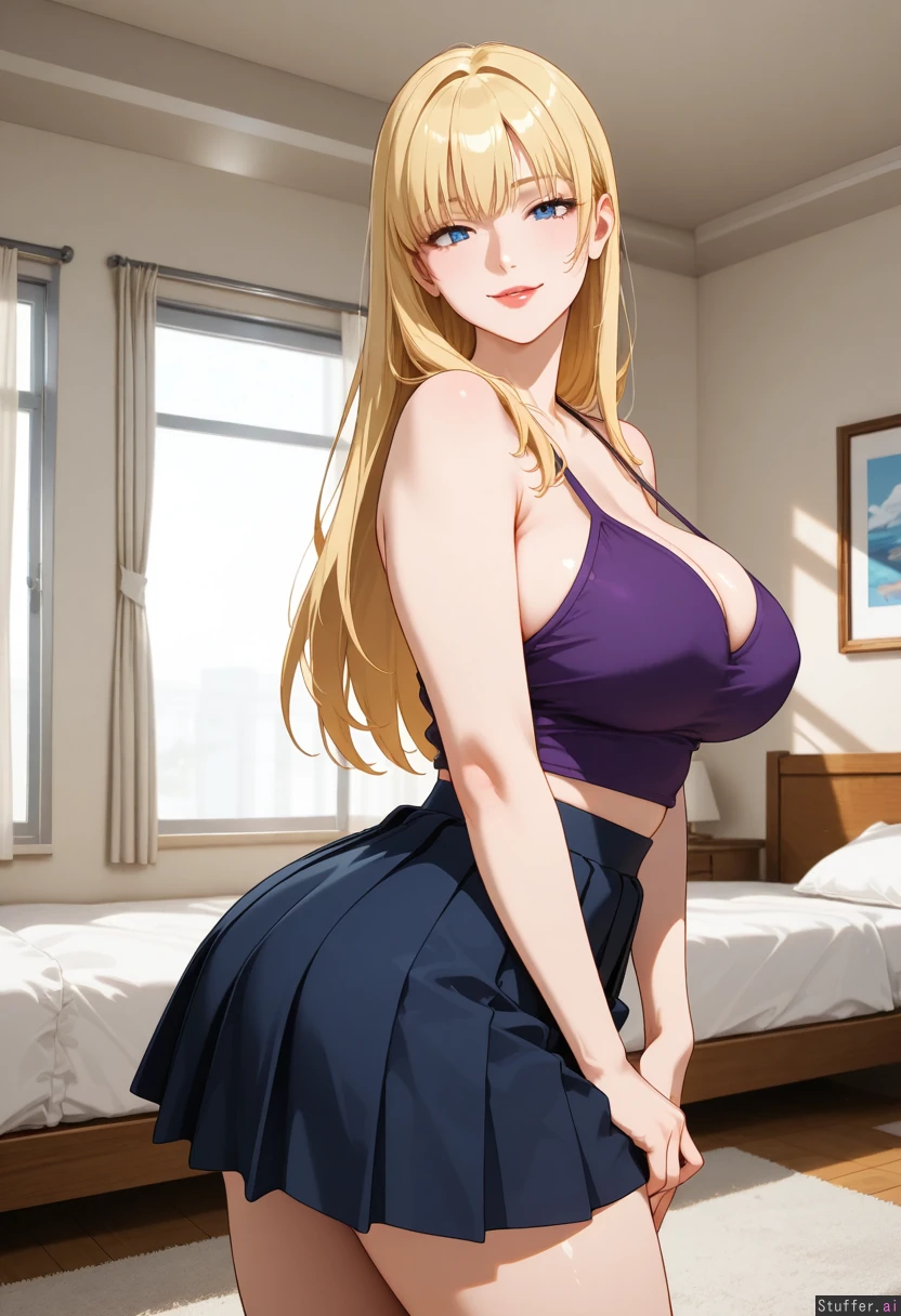 Complex_shading, complex_coloring, female, indoors, solo, alone, bedroom, supermodel, fancy_clothes, anime_style, anime_coloring, seductive_smile, long_neck, blonde_hair, hair_over_eyes, long_bangs, lipstick, huge_ass, pleated_skirt, halterneck, hair_over_one_eye, big_lips, ((ahegao, blushing, mouth closed,)huge belly inflation, pregnant belly:0.0)