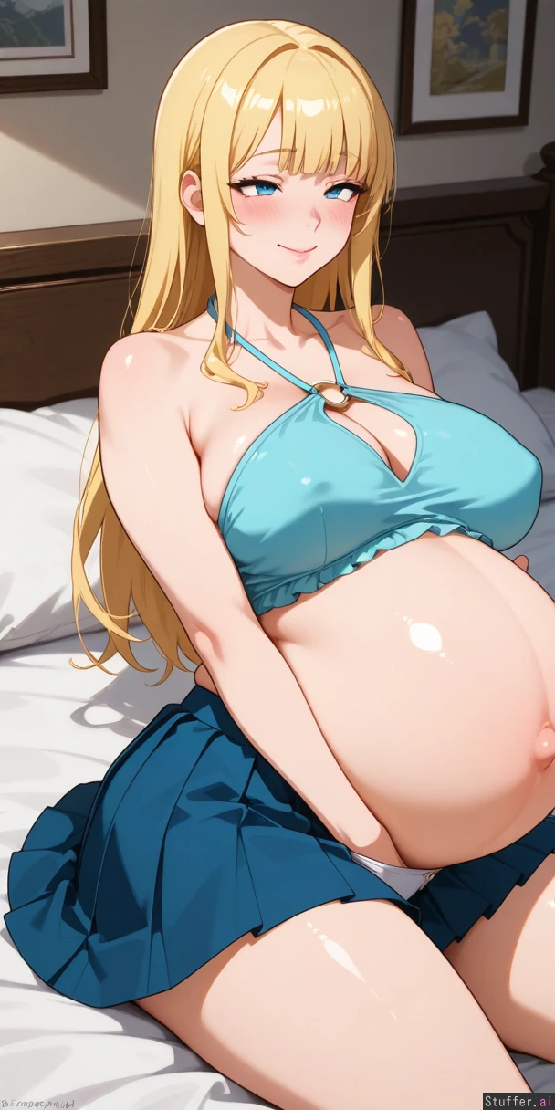 Complex_shading, complex_coloring, female, indoors, solo, alone, bedroom, supermodel, fancy_clothes, anime_style, anime_coloring, seductive_smile, long_neck, blonde_hair, hair_over_eyes, long_bangs, lipstick, huge_ass, pleated_skirt, halterneck, hair_over_one_eye, big_lips, Laying in bed, hand in panties ((ahegao, blushing, mouth closed,)huge belly inflation, pregnant belly:.987540)