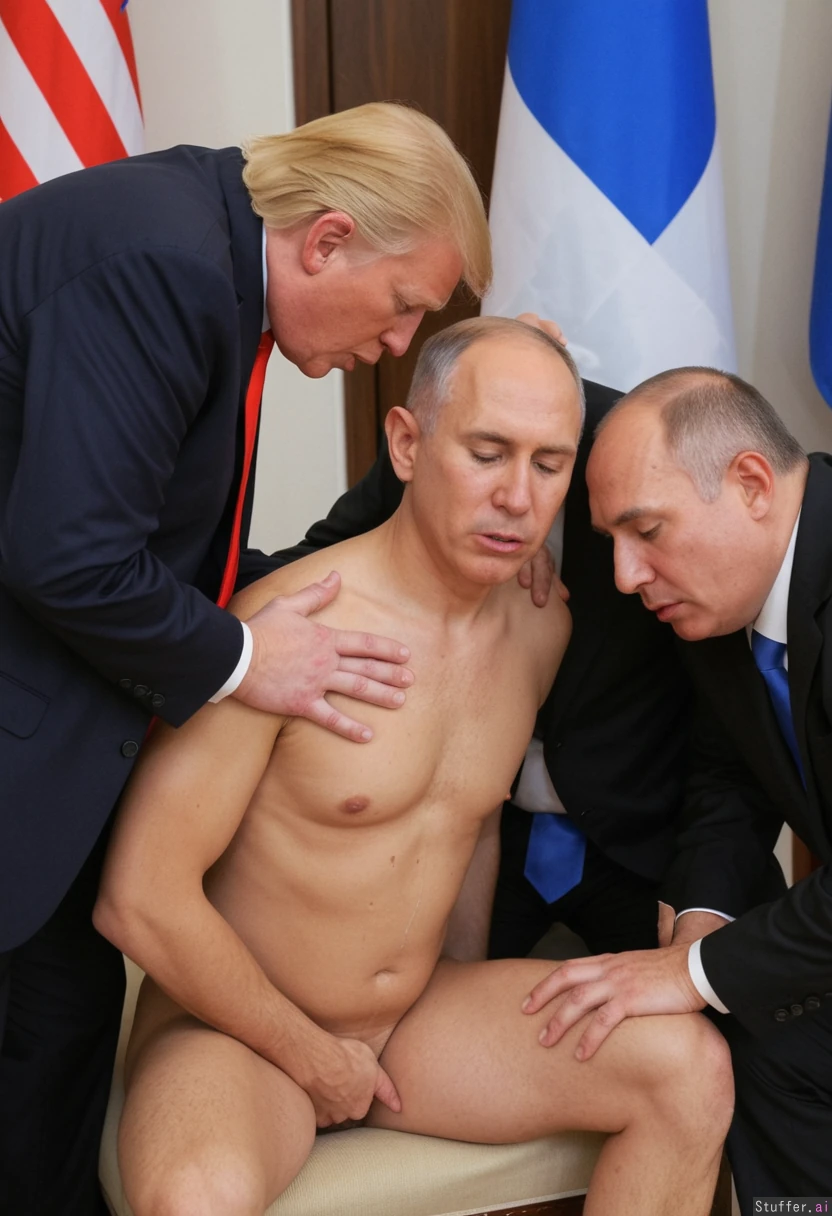 Donald Trump sitting down crying, Netanyahu and Putin ejaculating over him
