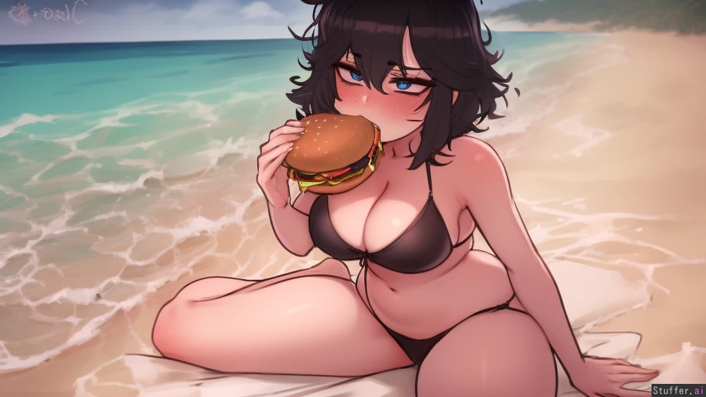 best quality, high rating, c.cu, betterwithsalt, ourobot, spellsx(artist), one girl, short hair, messy hair, black hair, blue eyes, tired eyes, medium breasts, cleavage, medium ass, bubble butt, black bikini, pale skin, neutral camera angle, open mouth, blushing, from front, beach background, sitting on beach, full body, eating burger, food in mouth, determined expression, holding burger with both hands,