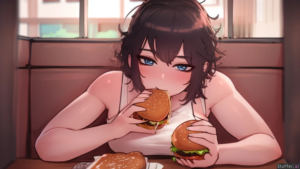 best quality, high rating, c.cu, betterwithsalt, ourobot, spellsx(artist), perfect anatomy, (perfect hands, perfect fingers), one girl, short hair, messy hair, black hair, blue eyes, tired eyes, medium breasts, white tank top, black short shorts, exposed midriff, pale skin, neutral camera angle, sitting in a booth, diner background, large window, looking_at_viewer, pov_across_table, eating burger, holding burger, chewing, visible from chest up,