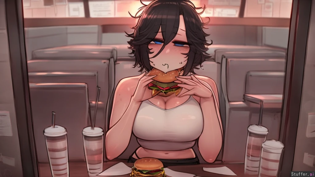 best quality, high rating, c.cu, betterwithsalt, ourobot, spellsx(artist), perfect anatomy, (perfect hands, perfect fingers), one girl, short hair, messy hair, black hair, blue eyes, tired eyes, medium breasts, white tank top, black short shorts, exposed midriff, pale skin, neutral camera angle, sitting in a booth, diner background, large window, looking_at_viewer, pov_across_table, eating burger, holding burger, chewing, visible from chest up,
