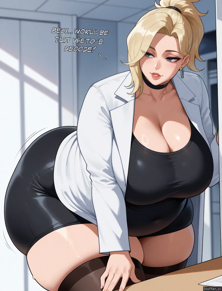 ((Solo, 1 woman)),((nyantcha)))), (krekkov), c.cu(artist), araneesama(artist), 8k, high resolution, gorgeous, masterpiece, ((flawless)), (((high rating))), ((highly detailed face)), beautiful face, ((((fat female)))), ((((thick milf)))), (((steamy))), (((skindentation))), ((())), ((())), ((((solo_female)))), (((()))), (((mercy from overwatch))), (()), (((White lab coat, black shirt, black skirt))), (()), (((Morbidly obese:1.5))), (big breasts), ((massive thighs)), ((wide hips)), fat arms, ((voluptuous)), ((huge fat ass)), hourglass figure, sweaty, (((Sexy, seductive))), (((panting, exhausted))), in office, leaning forward,