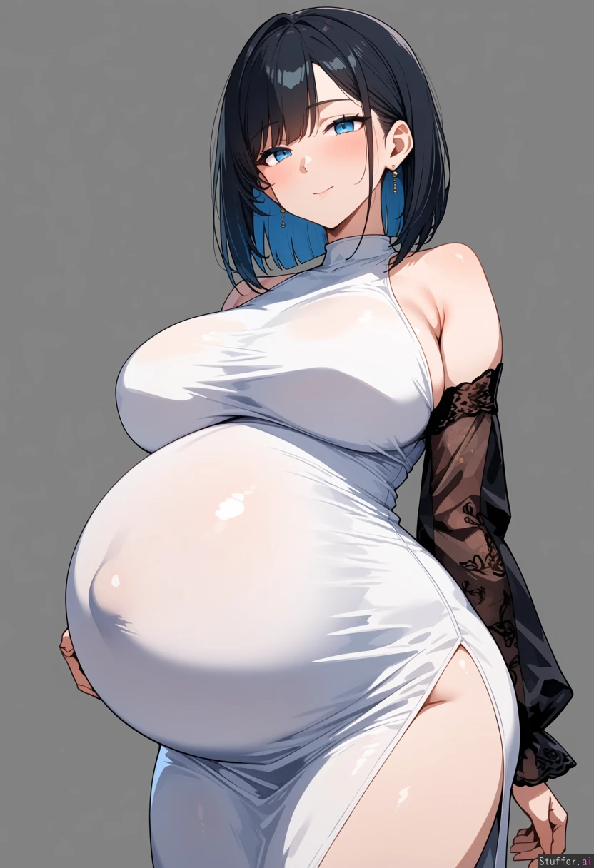 [Appearance = she has Fair skin, Blue eyes, black hair in a bob cut, voluptuous body, big breasts, Big belly pregnant] [White silk dress, loose sleeves with black lace]
