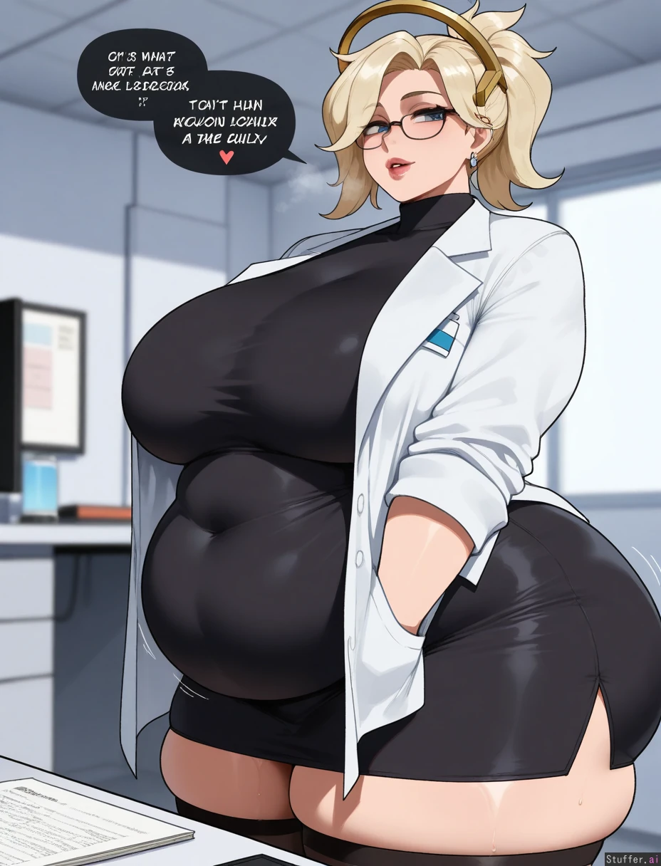 ((Solo, 1 woman)),((nyantcha)))), (krekkov), c.cu(artist), araneesama(artist), 8k, high resolution, gorgeous, masterpiece, ((flawless)), (((high rating))), ((highly detailed face)), beautiful face, ((((fat female)))), ((((thick milf)))), (((steamy))), (((skindentation))), ((())), ((())), ((((solo_female)))), (((()))), (((mercy from overwatch))), (()), (((White lab coat, black shirt, black skirt))), (()), (((Morbidly obese:1.4))), (big breasts), ((massive thighs)), ((wide hips)), fat arms, ((voluptuous)), ((huge fat ass)), hourglass figure, sweaty, (((Sexy, seductive))), (((burping))), in office,