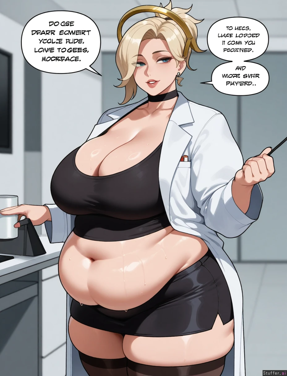 ((Solo, 1 woman)),((nyantcha)))), (krekkov), c.cu(artist), araneesama(artist), 8k, high resolution, gorgeous, masterpiece, ((flawless)), (((high rating))), ((highly detailed face)), beautiful face, ((((fat female)))), ((((thick milf)))), (((steamy))), (((skindentation))), ((())), ((())), ((((solo_female)))), (((()))), (((mercy from overwatch))), ((Cleavage)), (((White lab coat, black shirt, black skirt))), (()), (((Morbidly obese:1.4))), (big breasts), ((massive thighs)), ((wide hips)), fat arms, ((voluptuous)), ((huge fat ass)), hourglass figure, sweaty, (((Sexy, seductive))), (((burping))), in office,