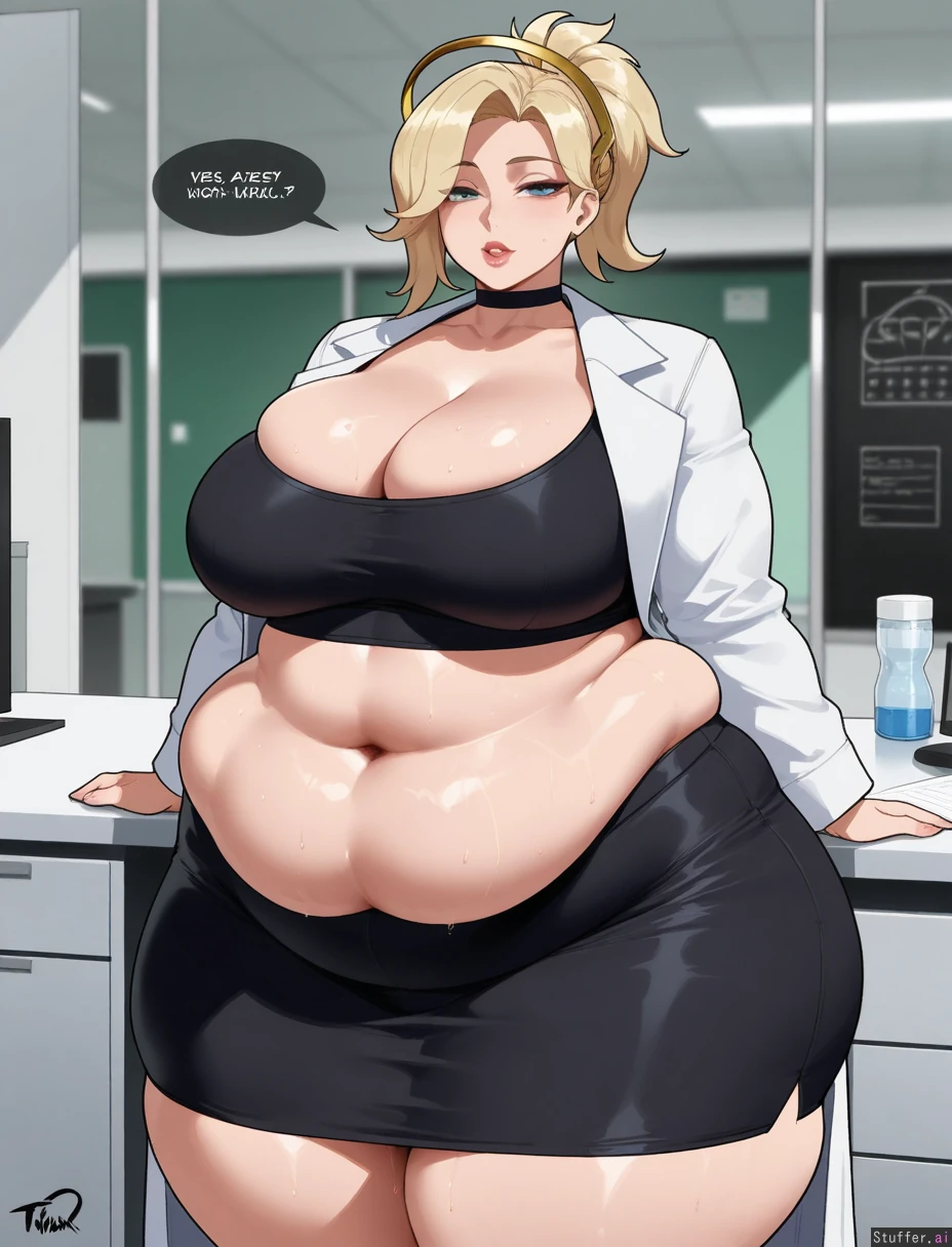 ((Solo, 1 woman)),((nyantcha)))), (krekkov), c.cu(artist), araneesama(artist), 8k, high resolution, gorgeous, masterpiece, ((flawless)), (((high rating))), ((highly detailed face)), beautiful face, ((((fat female)))), ((((thick milf)))), (((steamy))), (((skindentation))), ((())), ((())), ((((solo_female)))), (((()))), (((mercy from overwatch))), ((Cleavage)), (((White lab coat, black shirt, black skirt))), (()), (((Morbidly obese:1.5))), (big breasts), ((massive thighs)), ((wide hips)), fat arms, ((voluptuous)), ((huge fat ass)), hourglass figure, sweaty, (((Sexy, seductive))), (((burping))), in office,