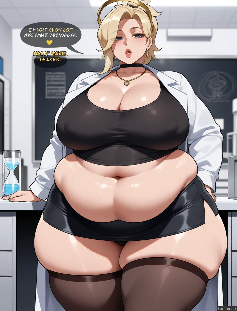 ((Solo, 1 woman)),((nyantcha)))), (krekkov), c.cu(artist), araneesama(artist), 8k, high resolution, gorgeous, masterpiece, ((flawless)), (((high rating))), ((highly detailed face)), beautiful face, ((((fat female)))), ((((thick milf)))), (((steamy))), (((skindentation))), ((())), ((())), ((((solo_female)))), (((()))), (((mercy from overwatch))), ((Cleavage)), (((White lab coat, black shirt, black skirt))), (()), (((Morbidly obese:1.5))), (big breasts), ((massive thighs)), ((wide hips)), fat arms, ((voluptuous)), ((huge fat ass)), hourglass figure, sweaty, (((Sexy, seductive))), (((((burping))))), in office,