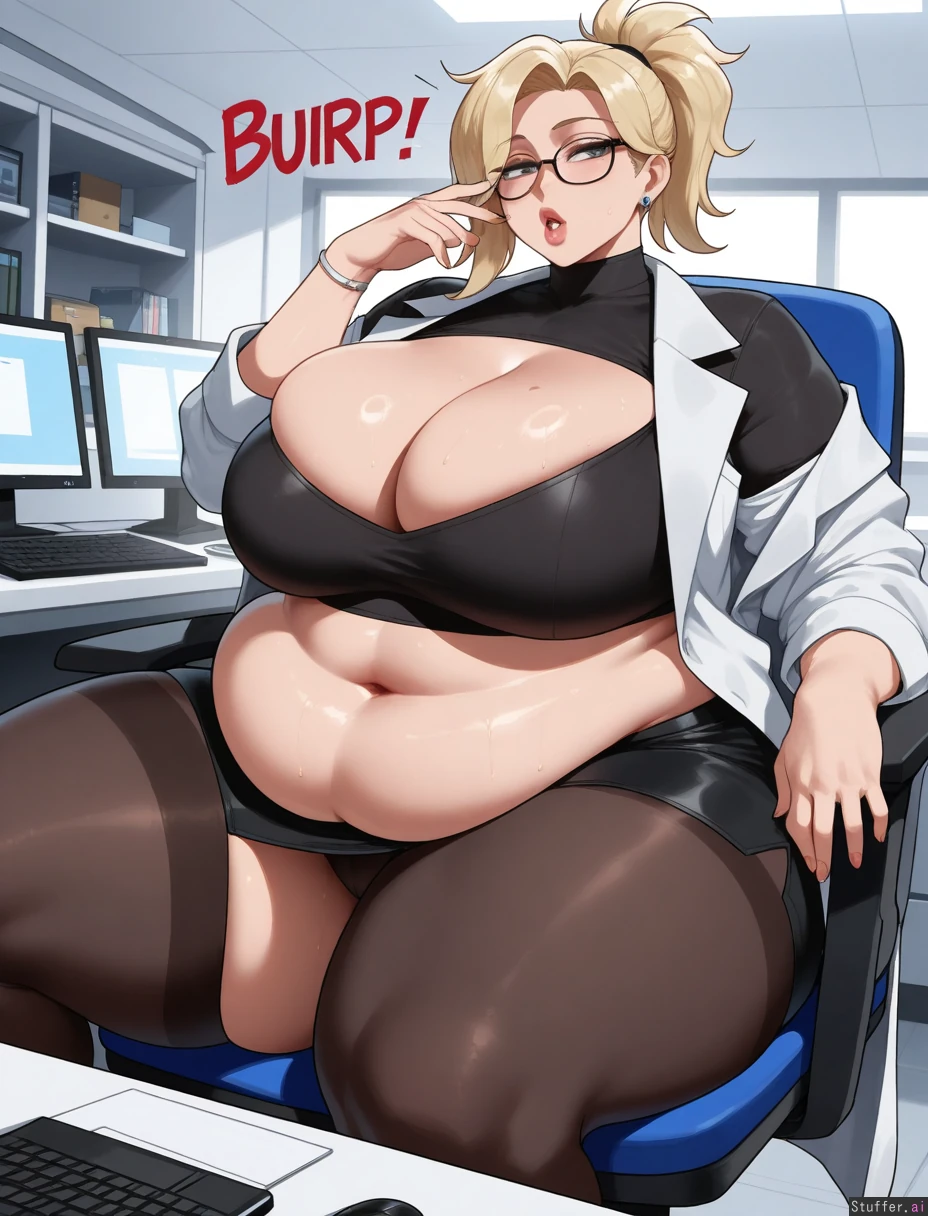 ((Solo, 1 woman)),((nyantcha)))), (krekkov), c.cu(artist), araneesama(artist), 8k, high resolution, gorgeous, masterpiece, ((flawless)), (((high rating))), ((highly detailed face)), beautiful face, ((((fat female)))), ((((thick milf)))), (((steamy))), (((skindentation))), ((())), ((())), ((((solo_female)))), (((()))), (((mercy from overwatch))), ((Cleavage)), (((White lab coat, black shirt, black skirt))), (()), (((Morbidly obese:1.5))), (big breasts), ((massive thighs)), ((wide hips)), fat arms, ((voluptuous)), ((huge fat ass)), hourglass figure, sweaty, (((Sexy, seductive))), (((((burping))))), in office, sitting in chair,