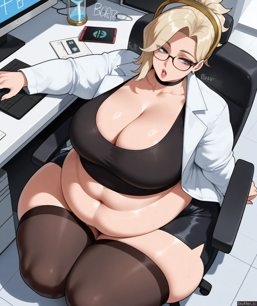 ((Solo, 1 woman)),((nyantcha)))), (krekkov), c.cu(artist), araneesama(artist), 8k, high resolution, gorgeous, masterpiece, ((flawless)), (((high rating))), ((highly detailed face)), beautiful face, ((((fat female)))), ((((thick milf)))), (((steamy))), (((skindentation))), ((())), ((())), ((((solo_female)))), (((()))), (((mercy from overwatch))), ((Cleavage)), (((White lab coat, black shirt, black skirt))), (()), (((Morbidly obese:1.5))), (big breasts), ((massive thighs)), ((wide hips)), fat arms, ((voluptuous)), ((huge fat ass)), hourglass figure, sweaty, from above, (((Sexy, seductive))), (((((burping))))), in office, sitting in chair,