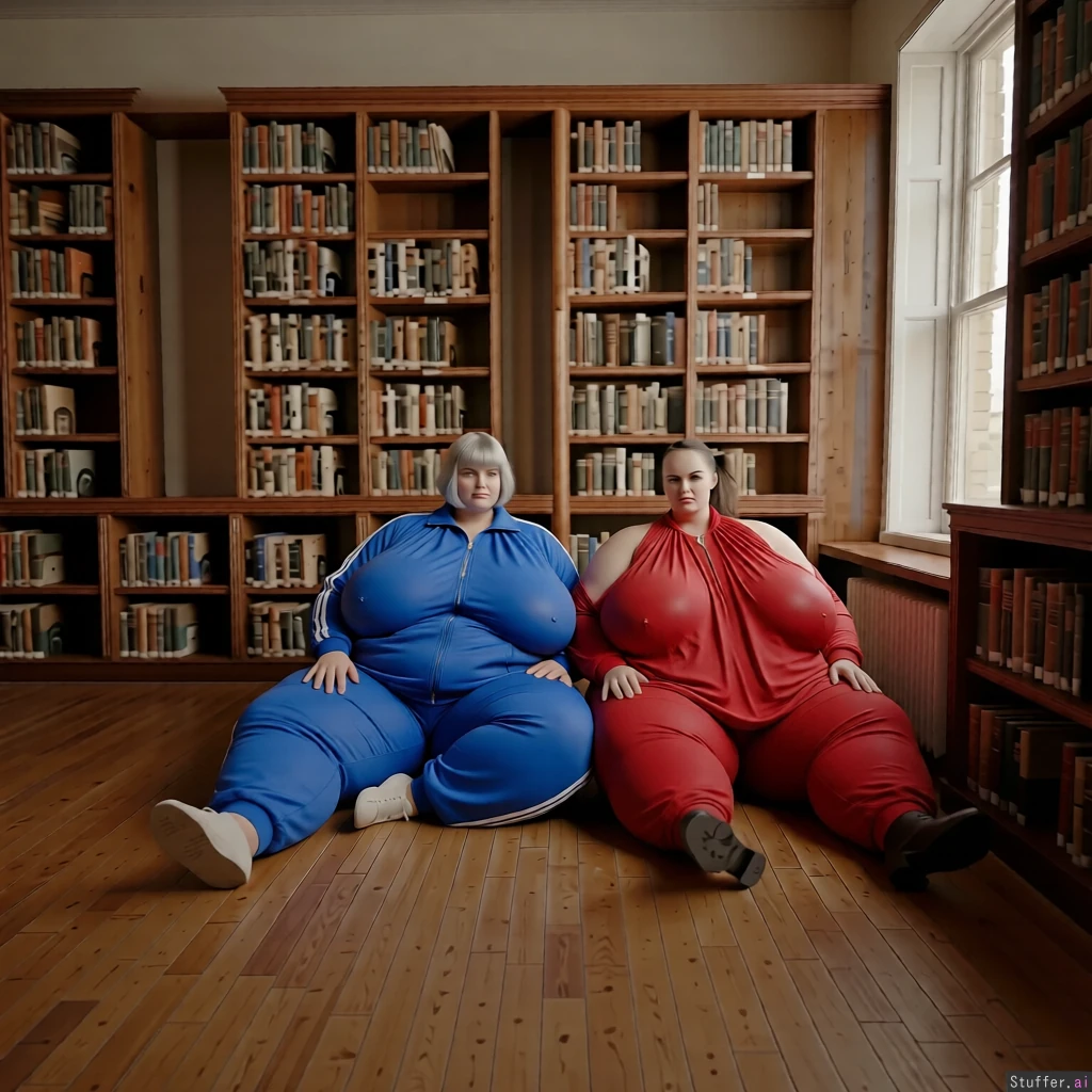 high quality, masterpiece, realistic lighting, high detail, higher saturation and contrast,make their breasts bulging and massively bigger and wider and hanging, fat shoulders, keep them fully clothed, full length track suit