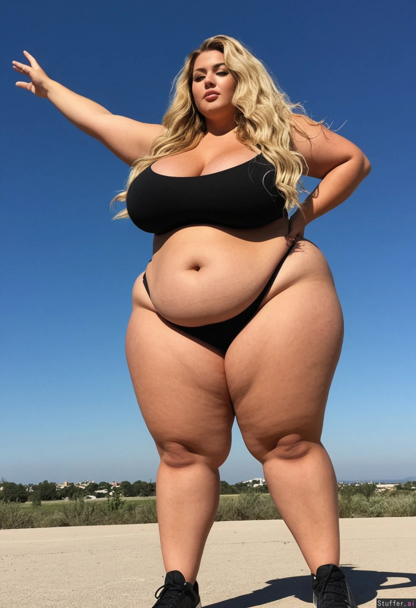 High definition Standing outside sunny day Tan skin ((((Extremely Long full giant wavy blonde hair)))) ((((Hyper_long hyper_extended flowing blonde hair)))) Black thong (tight black thong) Tight black bra Toned stomach ((Bulging out of outgrown clothes)) ((((Massive Bulging hips)))) ((((Mega wide hips)))) ((((Enormous protruding hips)))) (((Bulging rotund thighs)))
