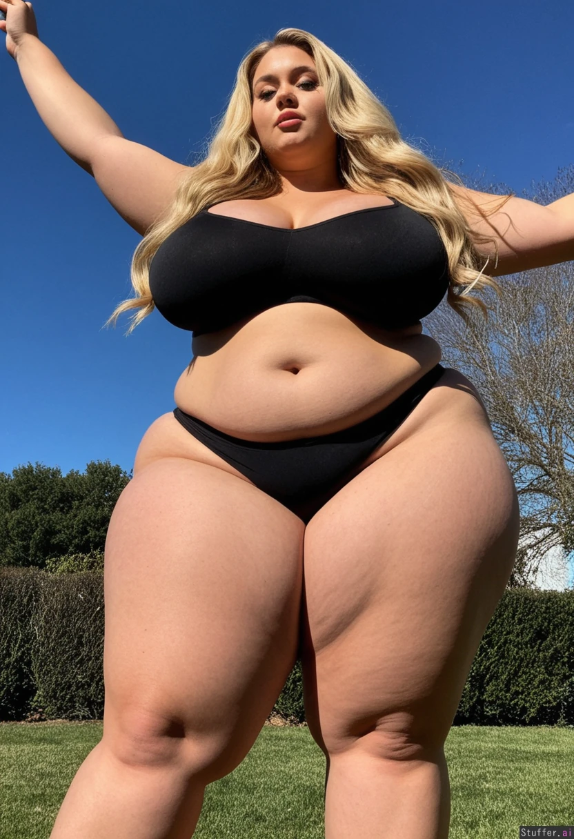 High definition Standing outside sunny day ((((Extremely Long full giant wavy blonde hair)))) ((((Hyper_long hyper_extended flowing blonde hair)))) Black thong (tight black thong) Tight black bra Toned stomach (((Thick Bulging out of outgrown clothes))) ((((Massive Bulging hips)))) ((((Mega wide hips)))) ((((Enormous protruding hips)))) ((((Bulging massive rotund thighs))))