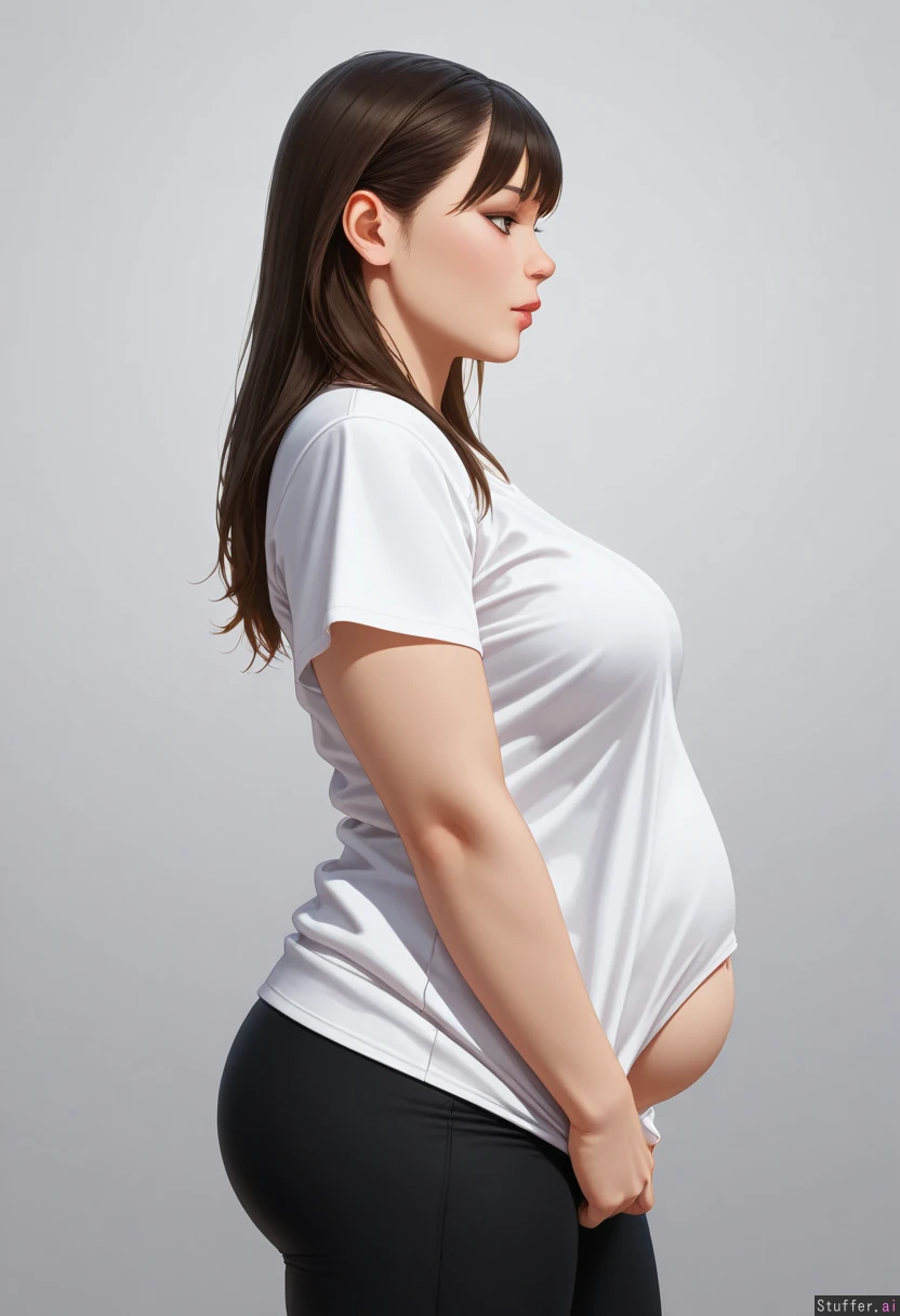 (Realistic:1.6), (highly detailed, high resolution, finely detailed, masterpiece:1.4), solo, 1girl, A brunette, eyeliner, lipstick, (Overweight:1.5), Leggings , (loose-fitting tee), standing, side view,