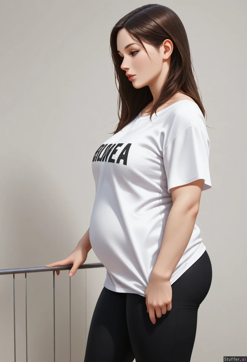 (Realistic:1.6), (highly detailed, high resolution, finely detailed, masterpiece:1.4), solo, 1girl, A brunette, eyeliner, lipstick, (Overweight:1.5), Leggings , (loose-fitting tee:1.3), standing, side view,