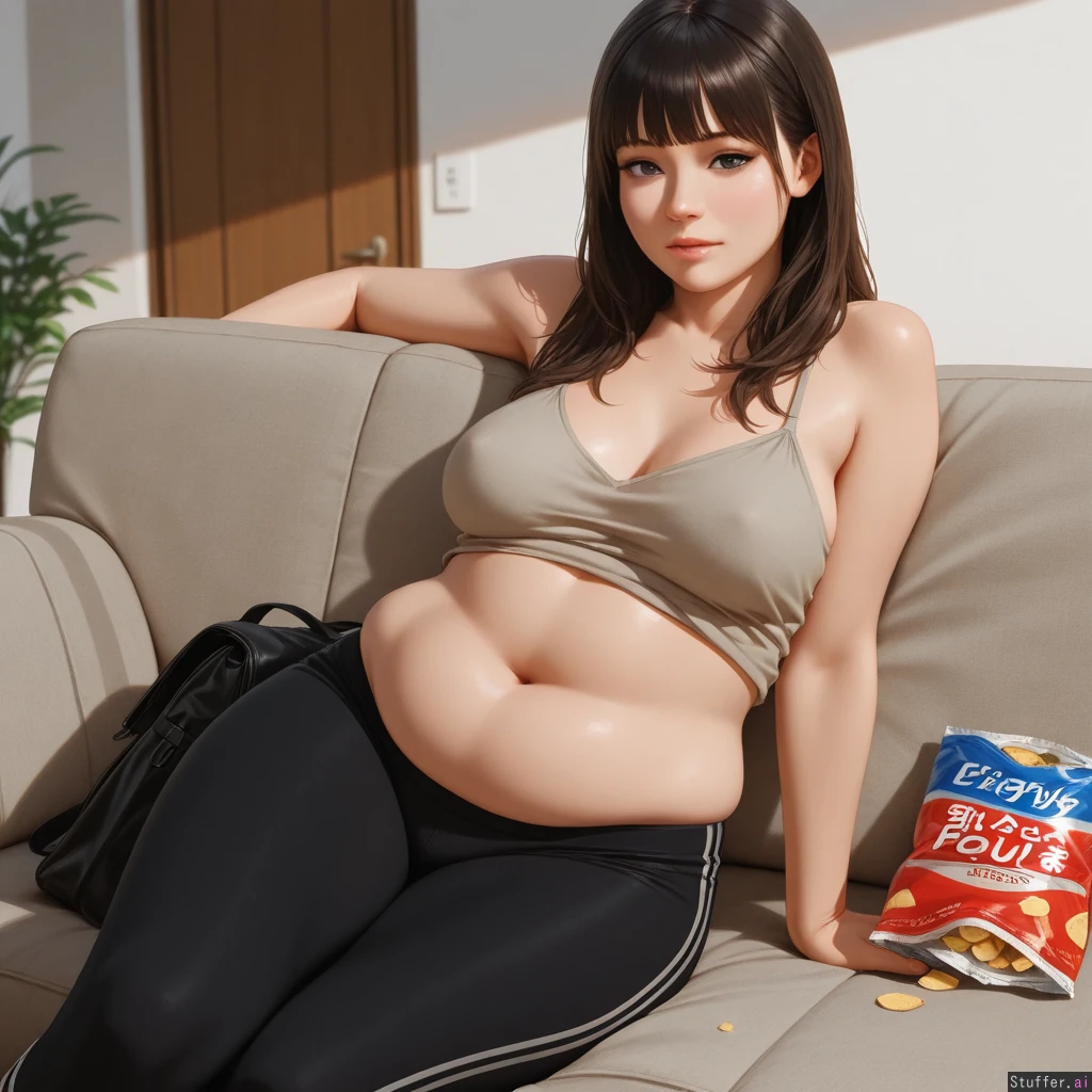 (Realistic:1.6), (highly detailed, high resolution, finely detailed, masterpiece:1.4), solo, 1girl, A brunette, (Overweight:1.5), Leggings , (loose-fitting plain top:1.3), On the couch, bag of chips,