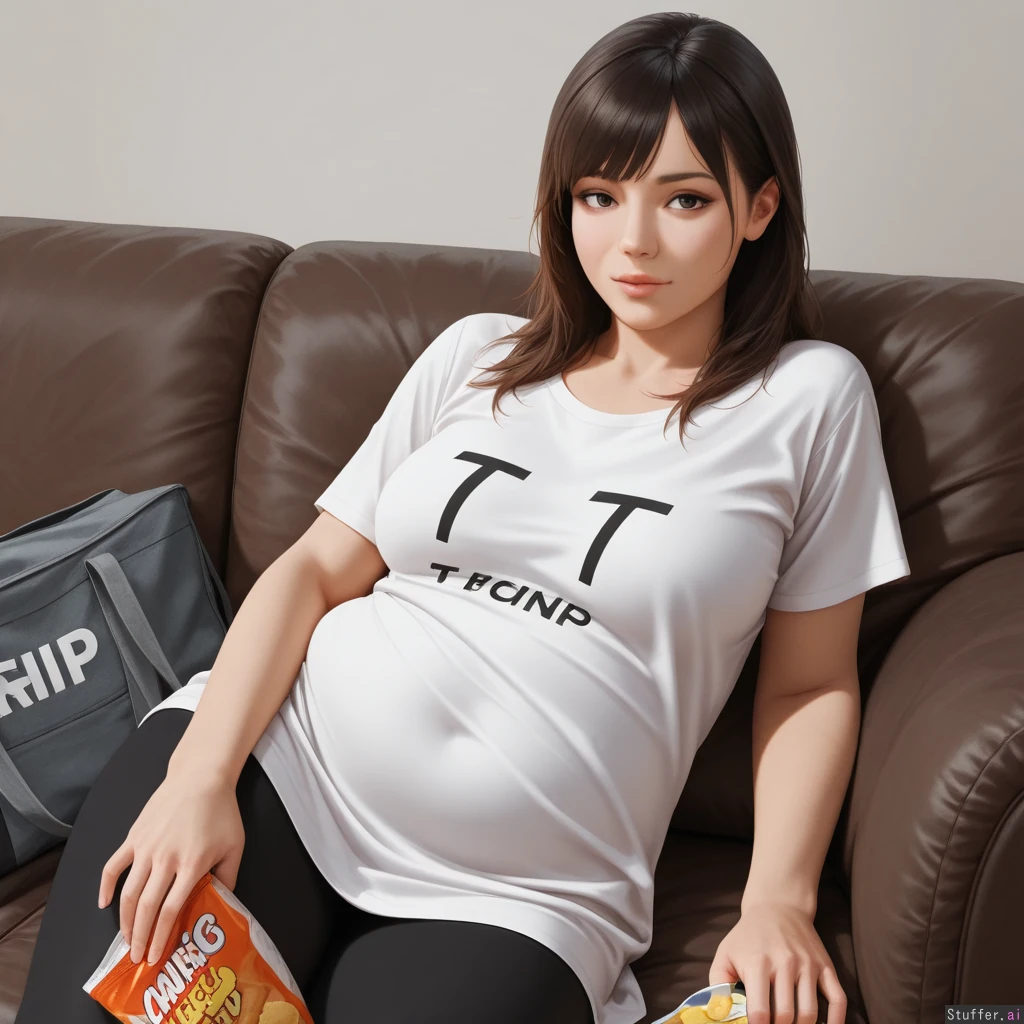 (Realistic:1.6), (highly detailed, high resolution, finely detailed, masterpiece:1.4), solo, 1girl, A brunette, (Overweight:1.5), Leggings , (loose-fitting t-shirt:1.3), On the couch, bag of chips,