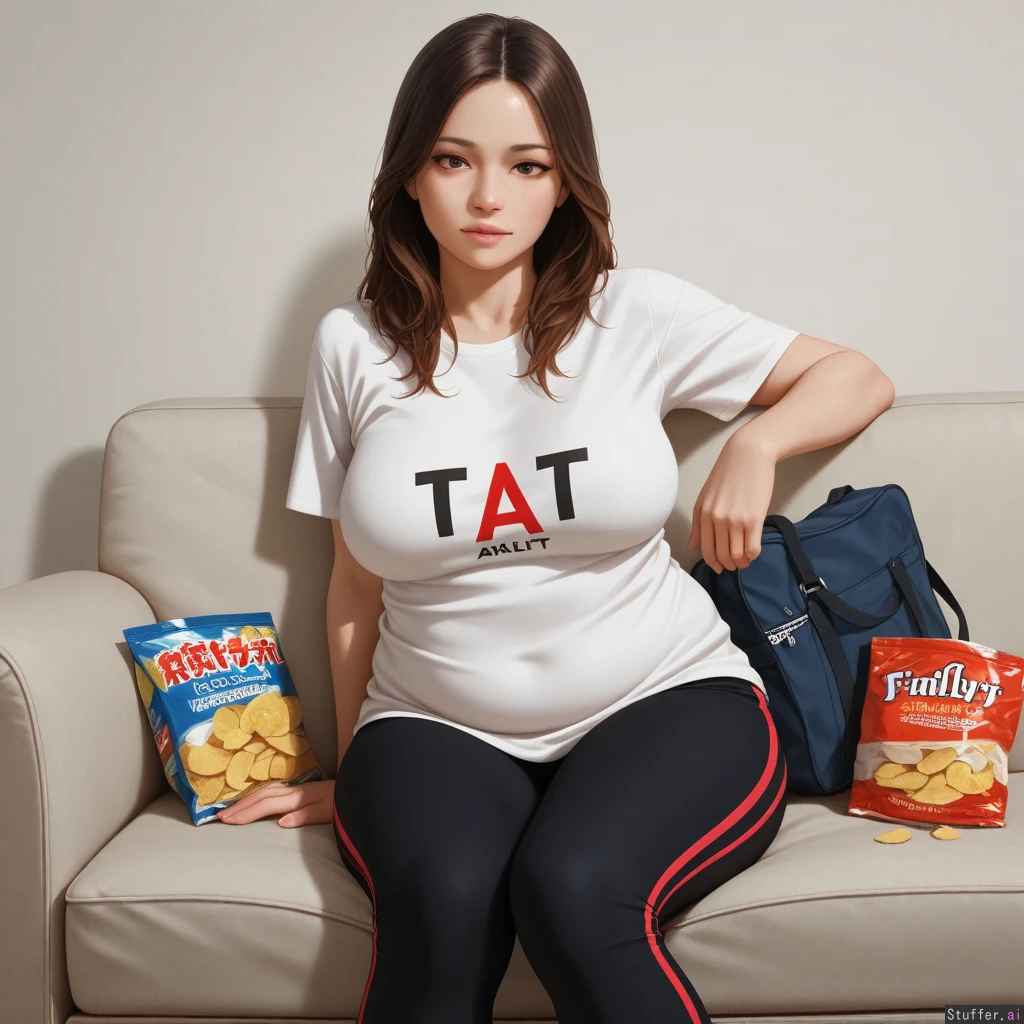 (Realistic:1.6), (highly detailed, high resolution, finely detailed, masterpiece:1.4), solo, 1girl, A brunette, (Overweight:1.5), Leggings , (loose-fitting t-shirt:1.3), On the couch, bag of chips,