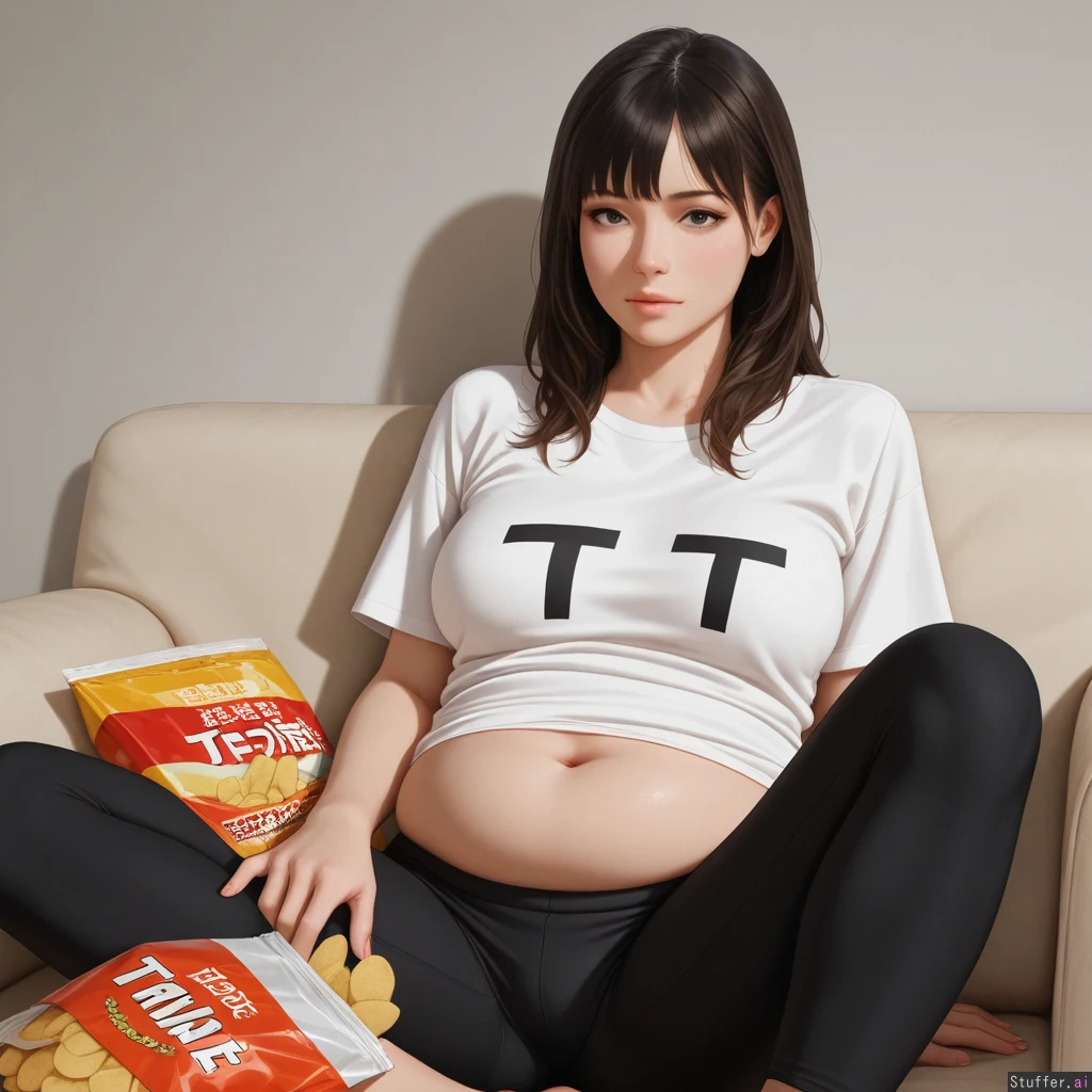 (Realistic:1.6), (highly detailed, high resolution, finely detailed, masterpiece:1.4), solo, 1girl, A brunette, (Fat:1.6), Leggings , (loose-fitting t-shirt:1.3), On the couch, bag of chips,