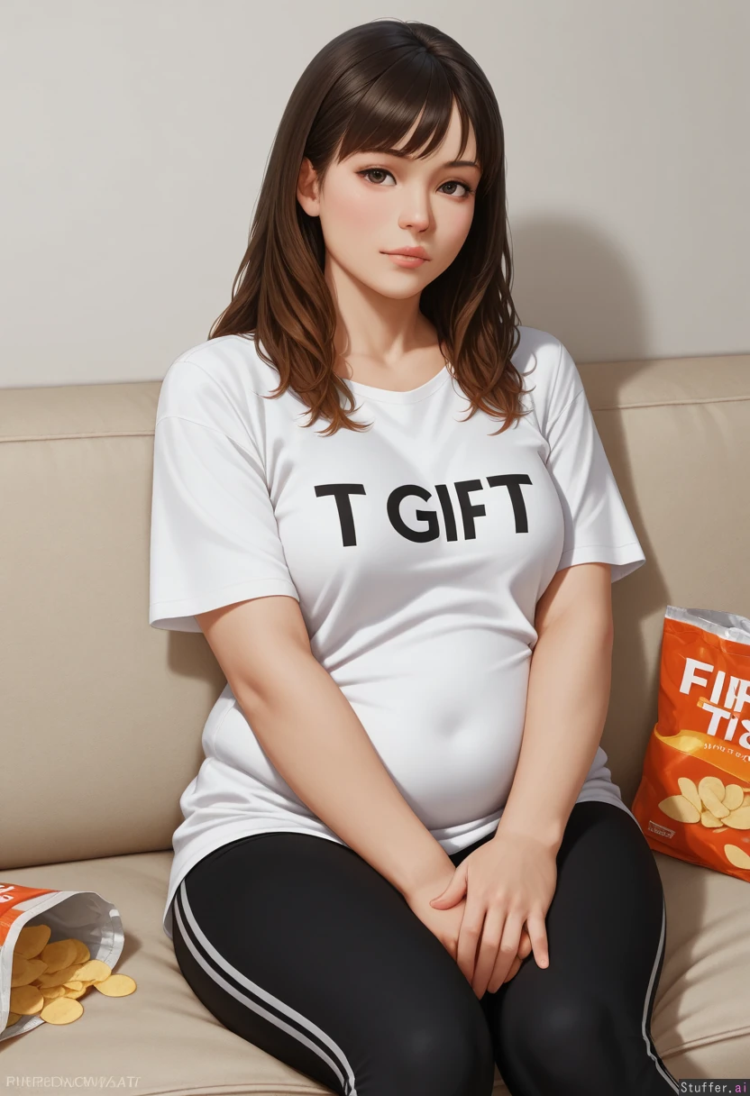 (Realistic:1.6), (highly detailed, high resolution, finely detailed, masterpiece:1.4), solo, 1girl, A brunette, (Fat:1.6), Leggings , (loose-fitting t-shirt:1.3), On the couch, chips