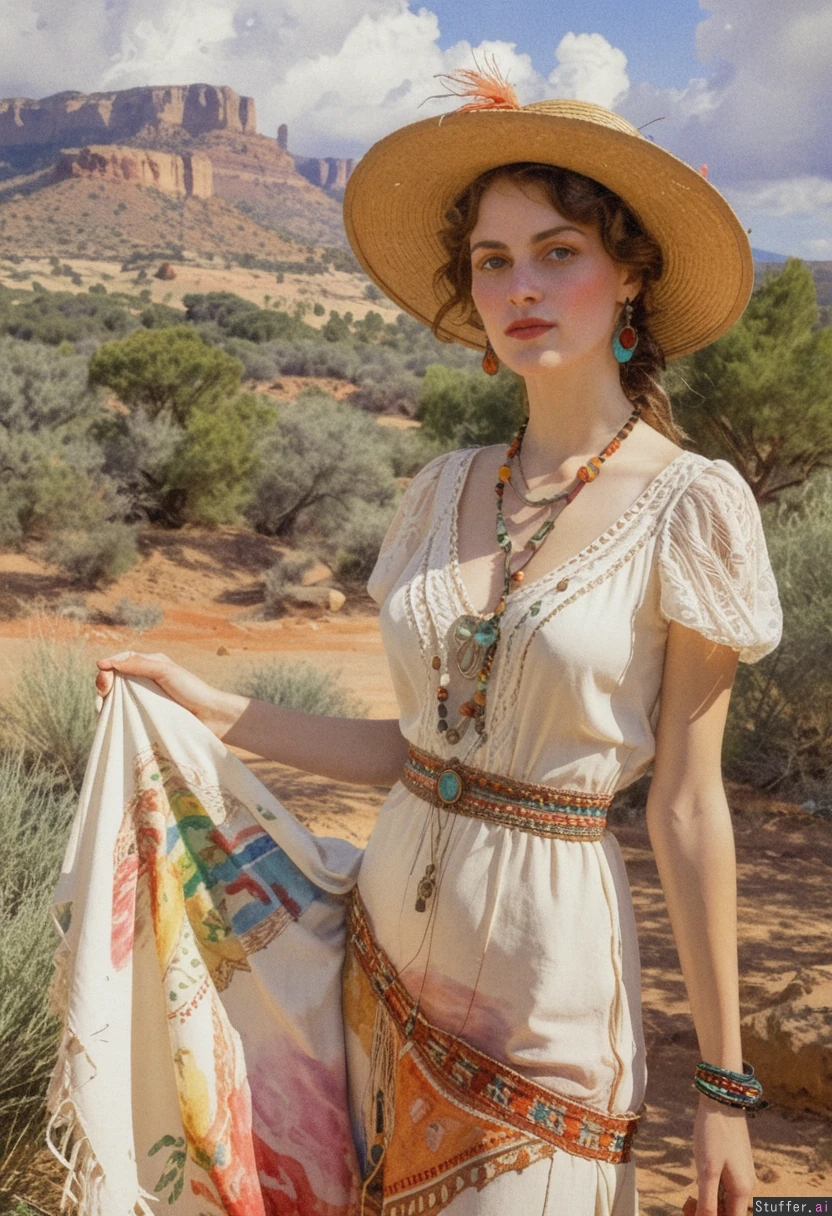 realistic beautiful woman in a stylish bohemian dress, many accessories, in a stunning outdoor landscape, detailed, intricate, watercolor, mixed media, vibrant palette, art style by Tamara de Lempicka and John Singer Sargent, and Elizabeth Murray, pastel palette (seed 2719032760)