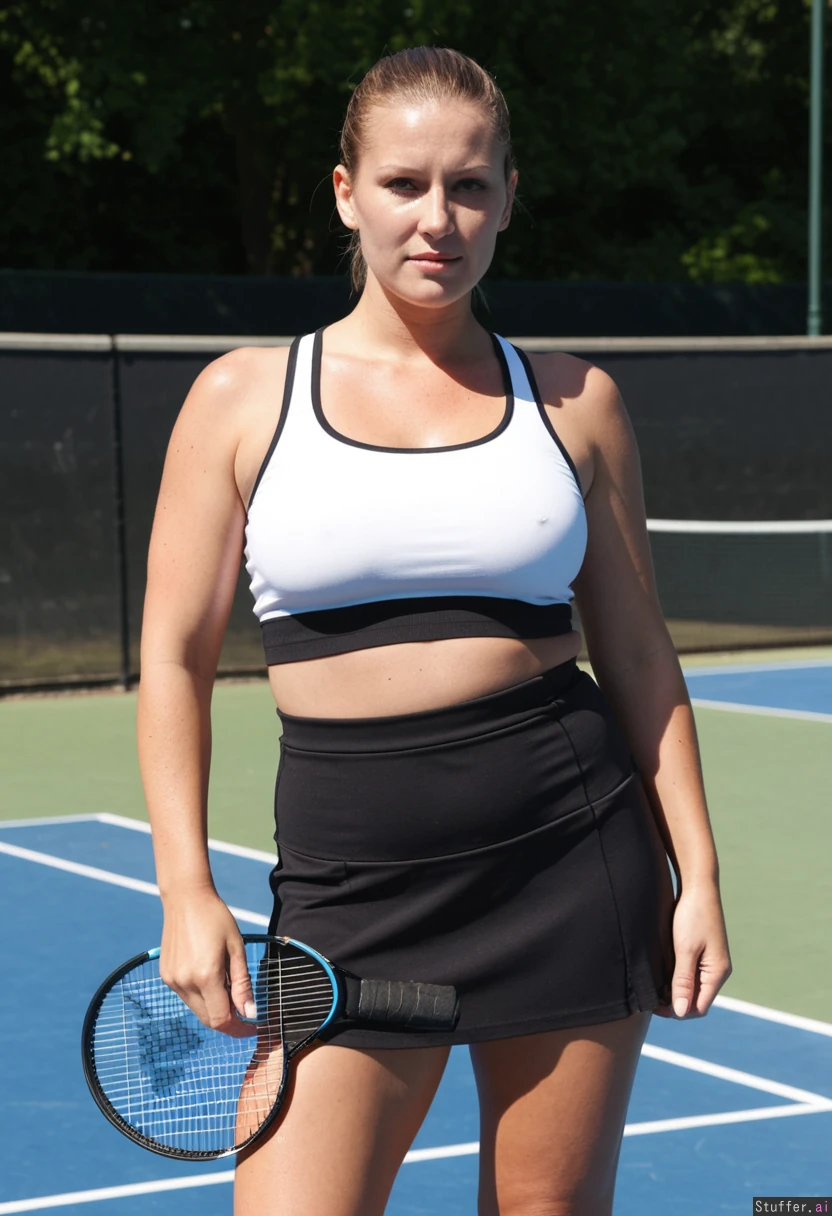 beautiful scandinavian woman, with seductive makeup, in her 30s, wearing tight tennis top, tight tennis skirt, looking & posing seductive, holding racket, in a tennis court, outdoor lighting, daytime, sunny weather, ultra photo realistic, 8k, gained weight after meal, round belly, fat rolls, mombod, 80mm camera lens
