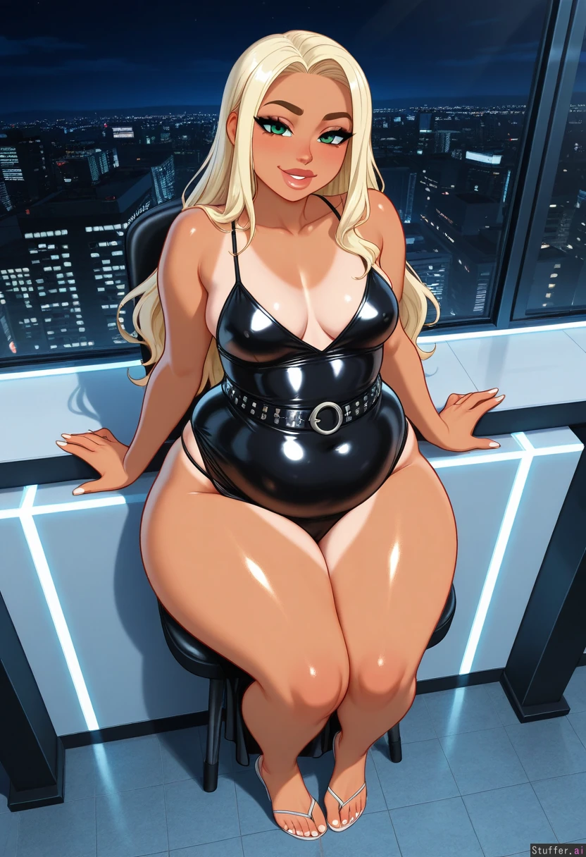 (chubby plump thick girl), (short curvy bottom heavy body), small full breasts, sexy mature face, straight silky blonde hair, bangs, sultry big green eyes, (luscious plump full lips), chubby cheeks, (sexy thick feet), (long thick plump toes), (long square polished fingernails), (wide square polished toenails), amazing quality, masterpiece, best quality, semi realistic digital line art, Marvel comics style, high angle view, full body, face focus, (perfect feet), (perfect hands), blushyspicy\(artist\), alexanderdinh\(artist\), mrpotatoparty\(artist\), high resolution, sharp clarity, defined outlines, intricate detail, rooftop bar, moonlight, sitting on chair, holding belly, tight short black dress, wide pouty lips, confident expression, (long white fingernails), (long white toenails), wide curvy hips, thick fat pussy bulge, huge fat thick plump ass, (tight smooth peach skin), (luscious thick square white nails), highly detailed face, highly detailed feet, highly detailed hands, arching thick plump hips, (Big chubby feminine feet), (big chubby feminine hands), detailed prominent pedicured toes, detailed prominent manicured fingers, feet down, (strapped silver high heels), (flaunting long thick glossy white nails), (protruding round pudgy belly), (thick bloated belly on thighs), perky thick nipples, detailed tan skin, Smaller torso, chubby arms, (voluptuous lower body), (big wide mouth), (huge juicy thick lips), (huge full fat belly), tight leather belt, full round ass bulging beyond hips, (full thick thighs), thick plump legs, plump calves, alluring feet, (seductive smile), detailed lip filler, detailed light eyeshadow, immersive background
