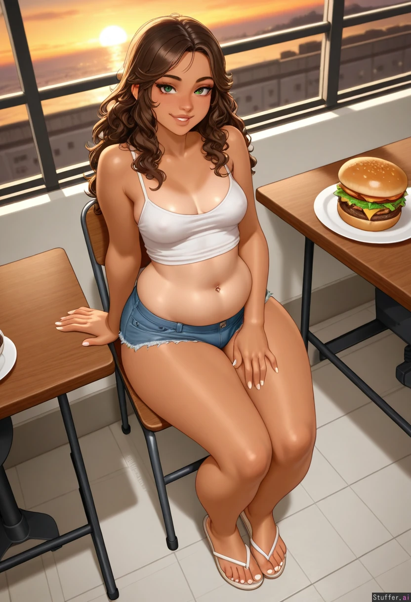 (chubby slim thick girl), (short curvy bottom heavy body), small perky breasts, sexy mature face, long silky wavy brunette hair, sultry big green eyes, (luscious plump wide full lips), chubby cheeks, (sexy thick feet), (long thick plump toes), (long square polished fingernails), (wide square polished toenails), amazing quality, masterpiece, best quality, hyper realistic digital line art, high angle view, full body, face focus, (perfect feet), (perfect hands), sciamano240\(artist\), ronindude\(artist\), kairunoburogu\(artist\), high resolution, sharp clarity, defined outlines, intricate detail, urban sunset, outside, sitting on chair, hands between thighs, big burger on table, pouty lips, confident expression, (long white fingernails), (long white toenails), slender curvy hips, (thick fat pussy bulge), huge fat plump ass, (tight smooth peach skin), (luscious thick square white nails), highly detailed face, highly detailed feet, highly detailed hands, arching plump hips, white spaghetti strap tank top, (Big chubby feminine feet), (big chubby feminine hands), detailed prominent pedicured toes, detailed prominent manicured fingers, feet down, tan flip flops, (flaunting long glossy white nails), (full bloated thick pudgy belly), perky thick nipples, (high waist denim shorts), detailed tan skin, Smaller torso, chubby arms, (voluptuous lower body), (big wide mouth), (huge juicy thick lips), slim waist, big belly, navel piercing, full round ass bulging beyond hips, (full thick thighs), thick plump legs, plump calves, alluring feet, (seductive smile), detailed lip filler, detailed light eyeshadow, immersive background