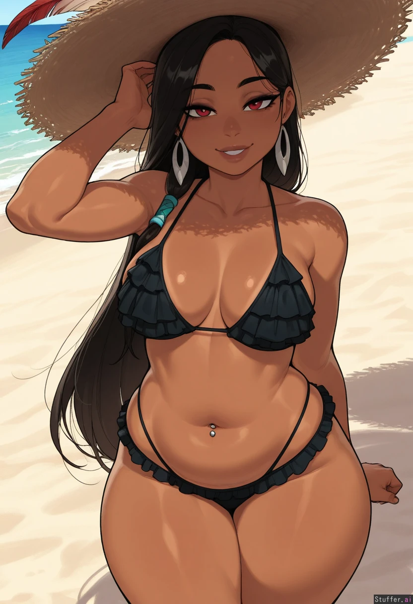 krekkov, KAMII MOMORU(artist), (highly detailed, best quality, masterpiece), (perfect anatomy, vibrant colours,, shadow, perfect shading), (beautiful face, beautiful eyes), (one girl), (Pocahontas), Native American, Navel piercing, ((black frilly bikini)), medium breasts, sun setting, beach, Thick thighs, soft belly, bloated belly, ( confident, proud, seductive, horny)), (She has gained weight, pudgey belly)