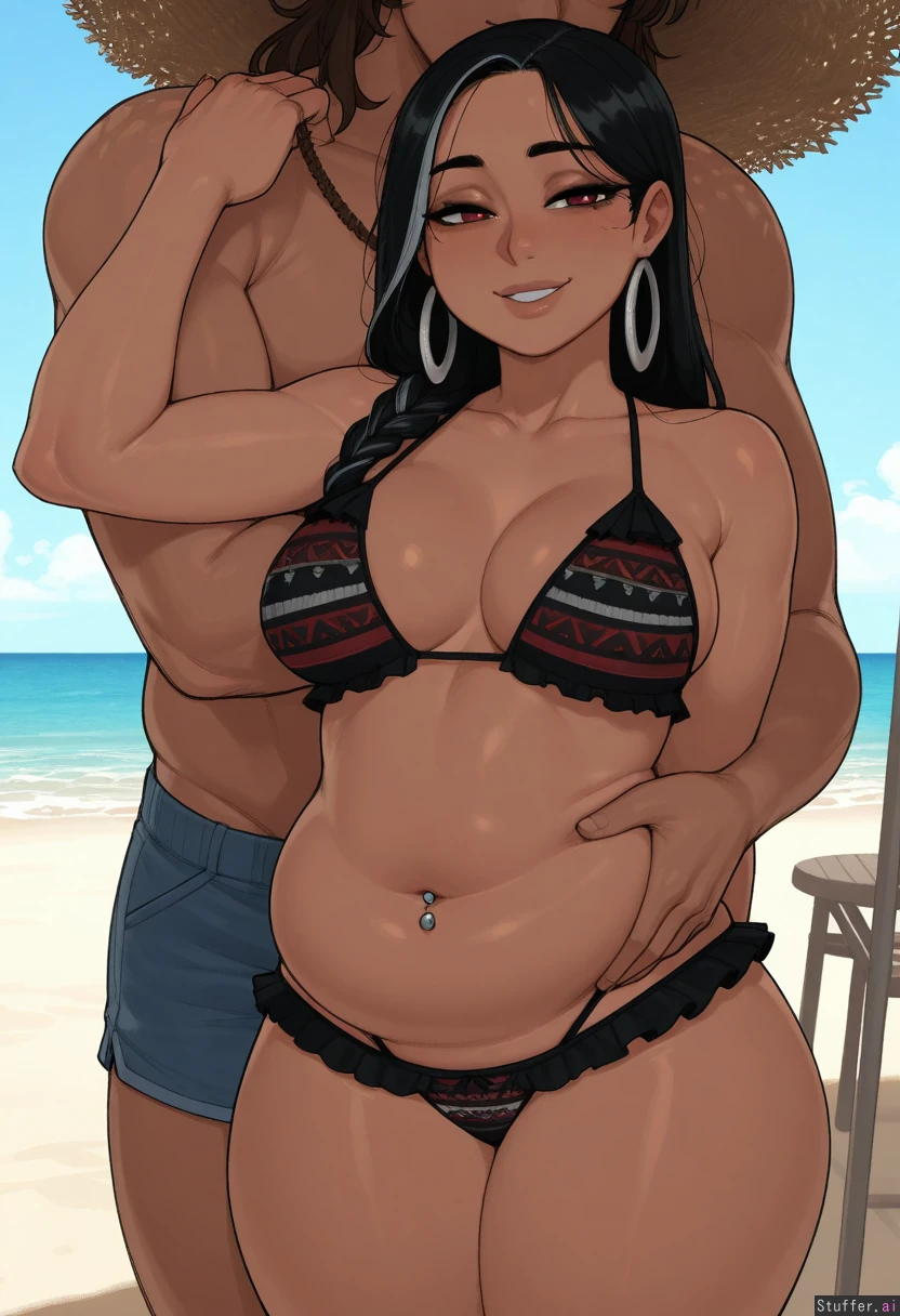 krekkov, KAMII MOMORU(artist), (highly detailed, best quality, masterpiece), (perfect anatomy, vibrant colours,, shadow, perfect shading), (beautiful face, beautiful eyes), (one girl), (Pocahontas), Native American, Navel piercing, ((black frilly bikini)), medium breasts, sun setting, beach, Thick thighs, soft belly, bloated belly, ( confident, proud, seductive, horny)), (((She has gained a lot of weight giving her a large soft pudgey belly:1.4))) ((Passionately french-kissing a handsomeguy:1.3)), ((guy embracing her))