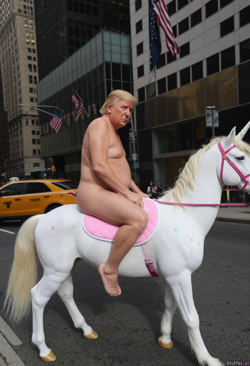 Old wrinkly Donald Trump, naked, riding unicorn, new york