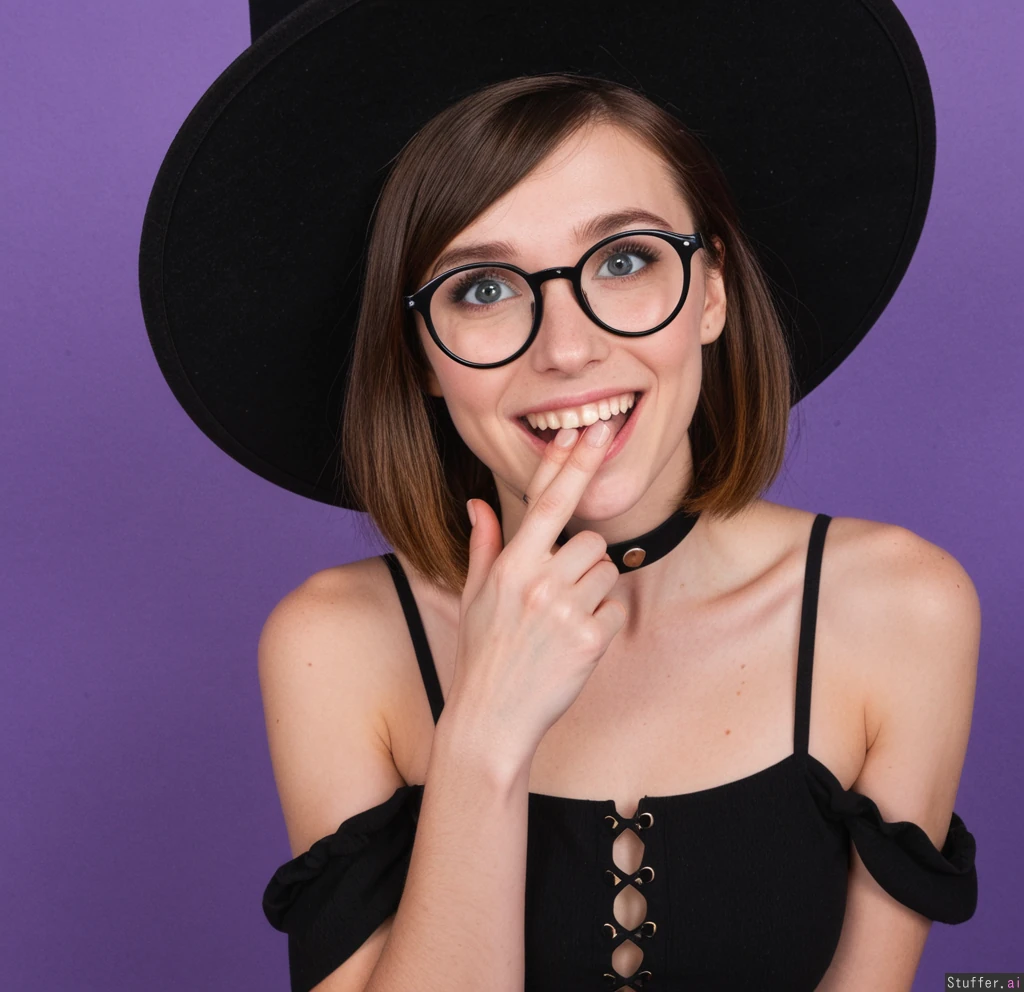 Cute Witch girl with short brown hair and blue eyes Big round glasses black cotton tunic sundress with clasps purple background Black witch hat thin choker exposed shoulders ((innocent:1.2)) ((smiling_eyes:1.3)) ((giggling:0.5)) ((shocked:1.2)) ((hand_over_mouth:1.2)) ((cool_undertone)) ((Natural:1.3))